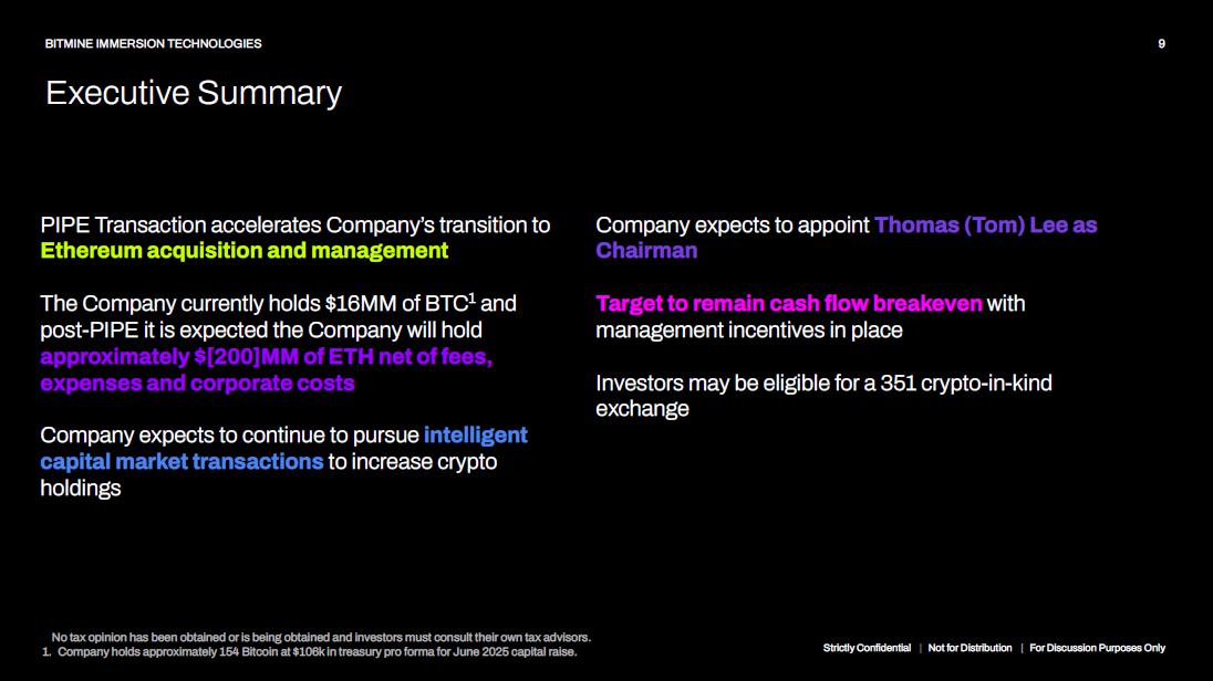 9 BITMINE IMMERSION TECHNOLOGIES Executive Summary PIPE Transaction accelerates Company’s transition to Ethereum acquisition and management The Company currently holds $16MM of BTC 1 and post - PIPE it is expected the Company will hold approximately $[200]MM of ETH net of fees, expenses and corporate costs Company expects to continue to pursue intelligent capital market transactions to increase crypto holdings No tax opinion has been obtained or is being obtained and investors must consult their own tax advisors. 1. Company holds approximately 154 Bitcoin at $106k in treasury pro forma for June 2025 capital raise. Strictly Confidential | Not for Distribution | For Discussion Purposes Only Company expects to appoint Thomas (Tom) Lee as Chairman Target to remain cash flow breakeven with management incentives in place Investors may be eligible for a 351 crypto - in - kind exchange