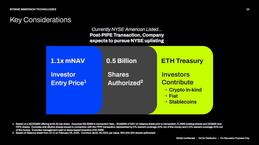 m NAV 1.1x Investor entry price 1 Key Considerations 10 BITMINE IMMERSION TECHNOLOGIES 1. Based on a $[200]MM offering at $4.50 per share. Assumes $[8.8]MM in transaction fees, ~$[16]MM of NAV on balance sheet prior to transaction, 6.2MM existing shares and [40]MM new PIPE shares. Excludes anti - dilutive shares issued in connection with the PIPE transaction represented by 5% warrant coverage 20% out of the money and 2.5% warrant coverage 20% out of the money. Excludes management cash or share - based incentive of $2.5MM 2. Based on Balance sheet from 10 - Q on February 28, 2025. Common stock, $0.0001 par value, 500,000,000 shares authorized ETH Treasury Investors Contribute ⇢ Crypto in - kind ⇢ Fiat ⇢ Stablecoins 0.5 Billion Shares Authorized 2 1.1x mNAV Strictly Confidential | Not for Distribution | For Discussion Purposes Only Investor Entry Price 1 Currently NYSE American Listed… Post - PIPE Transaction, Company expects to pursue NYSE uplisting