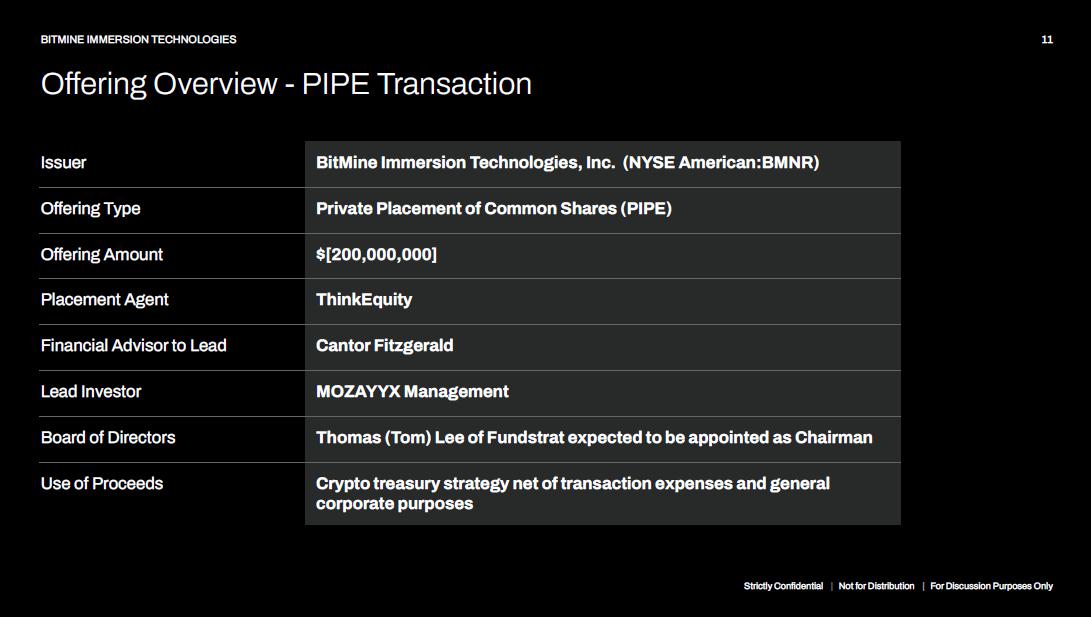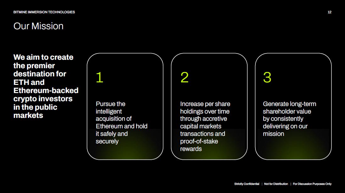 BitMine Immersion Technologies, Inc. (NYSE American:BMNR) Issuer Private Placement of Common Shares (PIPE) Offering Type $[200,000,000] Offering Amount ThinkEquity Placement Agent Cantor Fitzgerald Financial Advisor to Lead MOZAYYX Management Lead Investor Thomas (Tom) Lee of Fundstrat expected to be appointed as Chairman Board of Directors Crypto treasury strategy net of transaction expenses and general corporate purposes Use of Proceeds Strictly Confidential | Not for Distribution | For Discussion Purposes Only 11 BITMINE IMMERSION TECHNOLOGIES Offering Overview - PIPE Transaction