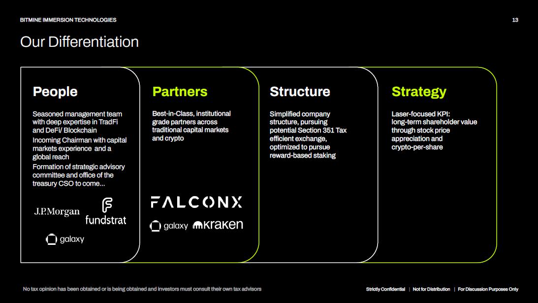 Strategy Laser - focused KPI: long - term shareholder value through stock price appreciation and crypto - per - share Structure Simplified company structure, pursuing potential Section 351 Tax efficient exchange, optimized to pursue reward - based staking Partners Best - in - Class, institutional grade partners across traditional capital markets and crypto People Seasoned management team with deep expertise in TradFi and DeFi/ Blockchain Incoming Chairman with capital markets experience and a global reach Formation of strategic advisory committee and office of the treasury CSO to come… Our Differentiation 13 BITMINE IMMERSION TECHNOLOGIES No tax opinion has been obtained or is being obtained and investors must consult their own tax advisors Strictly Confidential | Not for Distribution | For Discussion Purposes Only