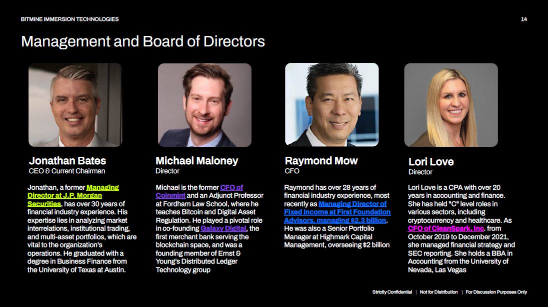 14 Strictly Confidential | Not for Distribution | For Discussion Purposes Only BITMINE IMMERSION TECHNOLOGIES Management and Board of Directors Jonathan Bates CEO & Current Chairman Raymond Mow CFO Michael Maloney Director Lori Love Director Jonathan, a former Managing Director at J.P. Morgan Securities , has over 30 years of financial industry experience. His expertise lies in analyzing market interrelations, institutional trading, and multi - asset portfolios, which are vital to the organization's operations. He graduated with a degree in Business Finance from the University of Texas at Austin. Michael is the former CFO of Coinmint and an Adjunct Professor at Fordham Law School, where he teaches Bitcoin and Digital Asset Regulation. He played a pivotal role in co - founding Galaxy Digital , the first merchant bank serving the blockchain space, and was a founding member of Ernst & Young’s Distributed Ledger Technology group Raymond has over 28 years of financial industry experience, most recently as Managing Director of Fixed Income at First Foundation Advisors, managing $2.3 billion . He was also a Senior Portfolio Manager at Highmark Capital Management, overseeing $2 billion Lori Love is a CPA with over 20 years in accounting and finance. She has held "C" level roles in various sectors, including cryptocurrency and healthcare. As CFO of CleanSpark, Inc . from October 2019 to December 2021, she managed financial strategy and SEC reporting. She holds a BBA in Accounting from the University of Nevada, Las Vegas
