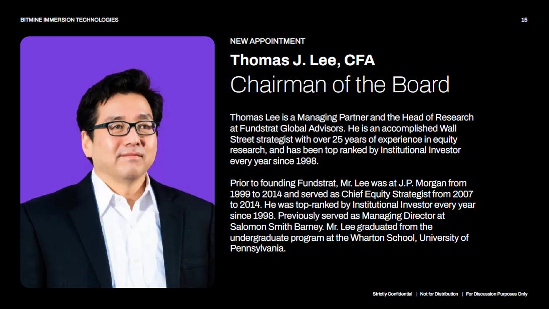 NEW APPOINTMENT Thomas J. Lee, CFA Chairman of the Board Thomas Lee is a Managing Partner and the Head of Research at Fundstrat Global Advisors. He is an accomplished Wall Street strategist with over 25 years of experience in equity research, and has been top ranked by Institutional Investor every year since 1998. Prior to founding Fundstrat, Mr. Lee was at J.P. Morgan from 1999 to 2014 and served as Chief Equity Strategist from 2007 to 2014. He was top - ranked by Institutional Investor every year since 1998. Previously served as Managing Director at Salomon Smith Barney. Mr. Lee graduated from the undergraduate program at the Wharton School, University of Pennsylvania. Strictly Confidential | Not for Distribution | For Discussion Purposes Only 15 BITMINE IMMERSION TECHNOLOGIES