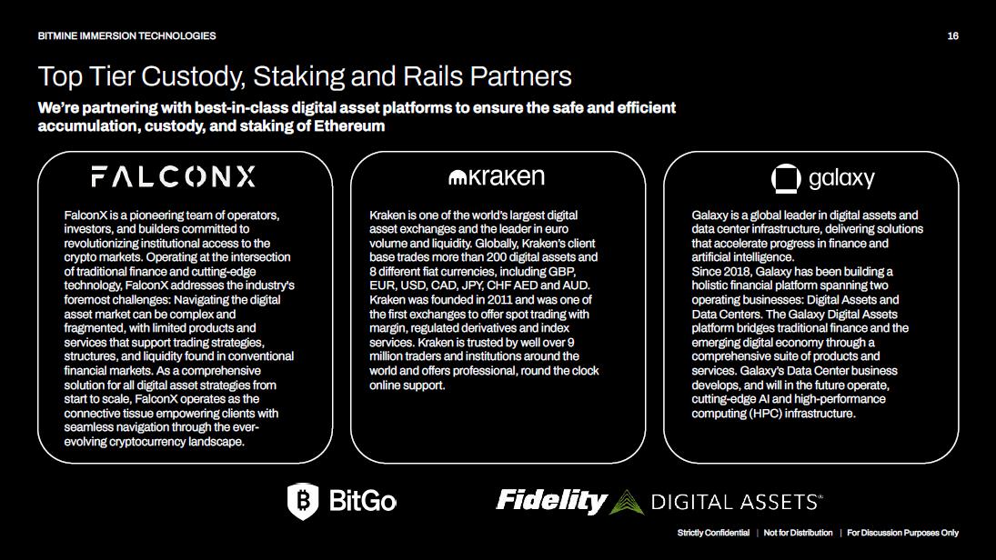 16 BITMINE IMMERSION TECHNOLOGIES FalconX is a pioneering team of operators, investors, and builders committed to revolutionizing institutional access to the crypto markets. Operating at the intersection of traditional finance and cutting - edge technology, FalconX addresses the industry's foremost challenges: Navigating the digital asset market can be complex and fragmented, with limited products and services that support trading strategies, structures, and liquidity found in conventional financial markets. As a comprehensive solution for all digital asset strategies from start to scale, FalconX operates as the connective tissue empowering clients with seamless navigation through the ever - evolving cryptocurrency landscape. Top Tier Custody, Staking and Rails Partners We’re partnering with best - in - class digital asset platforms to ensure the safe and efficient accumulation, custody, and staking of Ethereum Kraken is one of the world’s largest digital asset exchanges and the leader in euro volume and liquidity. Globally, Kraken’s client base trades more than 200 digital assets and 8 different fiat currencies, including GBP, EUR, USD, CAD, JPY, CHF AED and AUD. Kraken was founded in 2011 and was one of the first exchanges to offer spot trading with margin, regulated derivatives and index services. Kraken is trusted by well over 9 million traders and institutions around the world and offers professional, round the clock online support. Galaxy is a global leader in digital assets and data center infrastructure, delivering solutions that accelerate progress in finance and artificial intelligence. Since 2018, Galaxy has been building a holistic financial platform spanning two operating businesses: Digital Assets and Data Centers. The Galaxy Digital Assets platform bridges traditional finance and the emerging digital economy through a comprehensive suite of products and services. Galaxy’s Data Center business develops, and will in the future operate, cutting - edge AI and high - performance computing (HPC) infrastructure. Strictly Confidential | Not for Distribution | For Discussion Purposes Only
