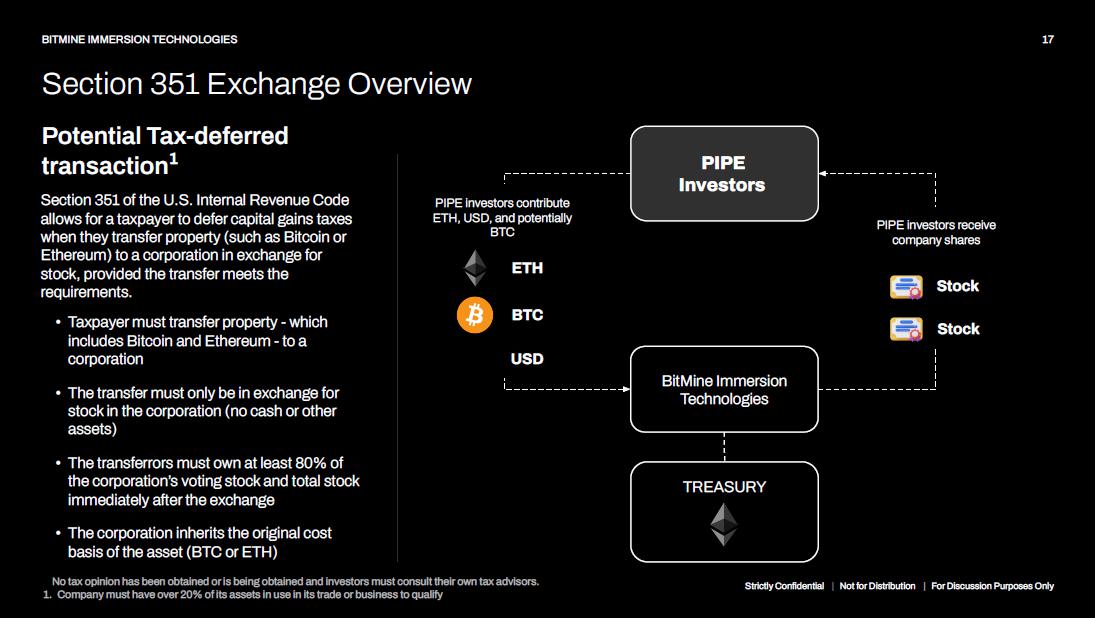 Section 351 of the Code provides that no gain or loss will be recognized if property is transferred to a corporation by one or more persons solely in exchange for stock in such corporation and immediately after the exchange such person or persons are in control (as defined in Section 368(c) of the Code) of the corporation. “Control” for purposes of Section 368(c) requires the transferors to own immediately after the exchange stock possessing at least 80% of the total combined voting power of all classes of stock entitled to vote and at least 80% of the total number of shares of all other classes of stock of the corporation. An exchange otherwise qualifying as a tax - deferred transaction pursuant to Section 351 of the Code will nevertheless generally be taxable if the 80% or more of the value of the assets of the transferee corporation are held for investment and are comprised of certain types of assets, including stocks and securities, stock rights, certain derivative contracts, money, foreign currency, indebtedness, and equity interests in entities in which substantially all of such entities’ assets are comprised of the assets listed above. While Congress gave Treasury the authority to enact regulations adding to this list of assets, no such regulations have been issued to date. It is intended that the PIPE Transaction qualify as a tax - deferred exchange pursuant to Section 351 of the Code provided that the offering results in investors owning common stock of the issuer meeting the 80% control test described herein (the “Intended Tax Treatment”) and the PIPE Transaction is expected to be structured in a manner to comply with the Intended Tax Treatment. The issuer and each investor that participates in the PIPE Transaction are expected to make certain factual representations regarding the Intended Tax Treatment, including, in the case of the issuer, that immediately after the exchange, at least 20% of the property contributed pursuant to the PIPE Transaction will be held for (or used to acquire assets held for) use in a trade or business of the issuer (and not solely for investment). While we expect the PIPE Transaction to more likely than not qualify for the Intended Tax Treatment, the lack of authority from the IRS related to the treatment of BTC, ETH and other cryptocurrencies under the US tax law and to the intended business activities of the issuer means that no assurances can be provided and each investor should consult with such investor’s own tax advisor regarding the tax consequences of the PIPE Transaction before participating in the transaction . If the PIPE Transaction qualifies for the Intended Tax Treatment, a U.S. person that exchanges ETH for common stock of the issuer is not expected not recognize any gain or loss with respect to such exchange. Such investor is expected to have an aggregate adjusted tax basis in the shares of common stock received pursuant to the PIPE Transaction equal to the aggregate adjusted tax basis of the ETH or other property surrendered in exchange therefor. The holding period for shares of common stock received pursuant to the PIPE Transaction are expected to include the investor’s holding period for the property surrendered in exchange therefor. If the PIPE Transaction does not qualify for the Intended Tax Treatment, investors generally would recognize gain or loss in an amount equal to the excess of (i) the fair market value of the common stock of the issuer received in the exchange over (ii) the investor’s adjusted tax basis in the property exchanged therefor. Any such gain is expected to be capital gain, and generally would be long - term capital gain if the investor’s holding period in the property exceeded one year at the time of the PIPE Transaction. An investor’s holding period for the common stock of the issuer would begin on the day after the PIPE Transaction and the investor’s tax basis in the common stock of the issuer received in the exchange would equal the fair market value of such common shares. Strictly Confidential | Not for Distribution | For Discussion Purposes Only 6 BITMINE IMMERSION TECHNOLOGIES Section 351 Exchange