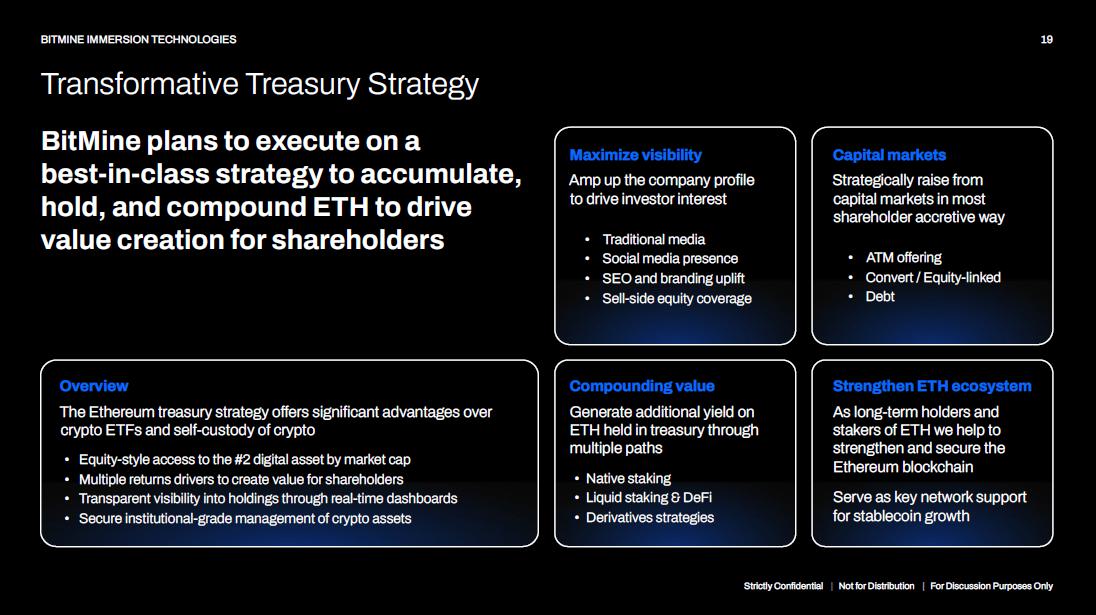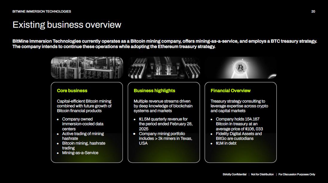 BitMine plans to execute on a best - in - class strategy to accumulate, hold, and compound ETH to drive value creation for shareholders Strictly Confidential | Not for Distribution | For Discussion Purposes Only 19 BITMINE IMMERSION TECHNOLOGIES Transformative Treasury Strategy • Traditional media • Social media presence • SEO and branding uplift • Sell - side equity coverage Maximize visibility Amp up the company profile to drive investor interest Compounding value Generate additional yield on ETH held in treasury through multiple paths • Native staking • Liquid staking & DeFi • Derivatives strategies Capital markets Strategically raise from capital markets in most shareholder accretive way • ATM offering • Convert / Equity - linked • Debt Strengthen ETH ecosystem As long - term holders and stakers of ETH we help to strengthen and secure the Ethereum blockchain Serve as key network support for stablecoin growth Overview The Ethereum treasury strategy offers significant advantages over crypto ETFs and self - custody of crypto • Equity - style access to the #2 digital asset by market cap • Multiple returns drivers to create value for shareholders • Transparent visibility into holdings through real - time dashboards • Secure institutional - grade management of crypto assets