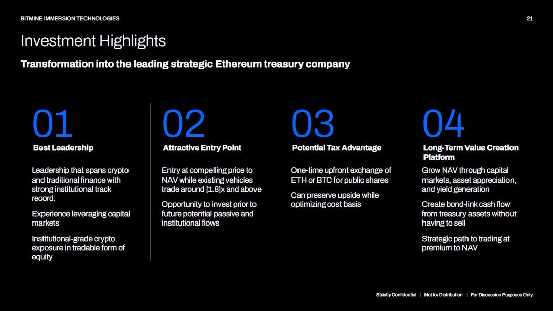 21 Strictly Confidential | Not for Distribution | For Discussion Purposes Only BITMINE IMMERSION TECHNOLOGIES Investment Highlights Transformation into the leading strategic Ethereum treasury company One - time upfront exchange of ETH or BTC for public shares Can preserve upside while optimizing cost basis 04 Long - Term Value Creation Platform Grow NAV through capital markets, asset appreciation, and yield generation Create bond - link cash flow from treasury assets without having to sell Strategic path to trading at premium to NAV Entry at compelling price to NAV while existing vehicles trade around [1.8]x and above Opportunity to invest prior to future potential passive and institutional flows 03 Potential Tax Advantage Leadership that spans crypto and traditional finance with strong institutional track record. Experience leveraging capital markets Institutional - grade crypto exposure in tradable form of equity 01 Best Leadership 02 Attractive Entry Point