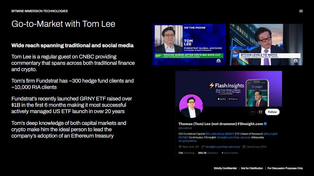 Go - to - Market with Tom Lee 22 BITMINE IMMERSION TECHNOLOGIES Wide reach spanning traditional and social media Tom Lee is a regular guest on CNBC providing commentary that spans across both traditional finance and crypto. Tom’s firm Fundstrat has ~300 hedge fund clients and ~10,000 RIA clients Fundstrat’s recently launched GRNY ETF raised over $1B in the first 6 months making it most successful actively managed US ETF launch in over 20 years Tom’s deep knowledge of both capital markets and crypto make him the ideal person to lead the company’s adoption of an Ethereum treasury Strictly Confidential | Not for Distribution | For Discussion Purposes Only