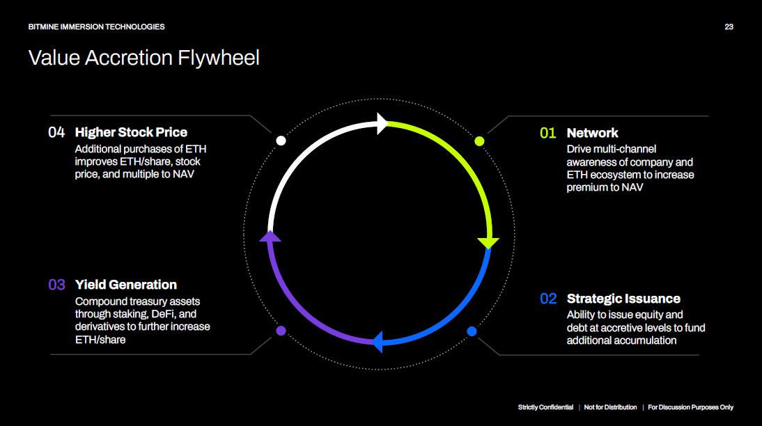23 BITMINE IMMERSION TECHNOLOGIES Value Accretion Flywheel 01 Network Drive multi - channel awareness of company and ETH ecosystem to increase premium to NAV 02 Strategic Issuance Ability to issue equity and debt at accretive levels to fund additional accumulation Higher Stock Price Additional purchases of ETH improves ETH/share, stock price, and multiple to NAV 04 03 Yield Generation Compound treasury assets through staking, DeFi, and derivatives to further increase ETH/share Strictly Confidential | Not for Distribution | For Discussion Purposes Only