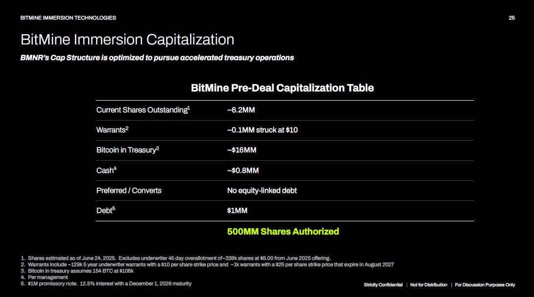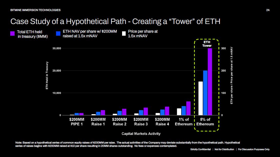 24 BITMINE IMMERSION TECHNOLOGIES Case Study of a Hypothetical Path - Creating a “Tower” of ETH Price per share at 1.5x mNAV ETH NAV per share w/ $200MM raised at 1.5x mNAV Total ETH held in treasury ($MM) Note: Based on a hypothetical series of common equity raises of $200MM per raise. The actual activities of the Company may deviate substantially from the hypothetical path. Hypothetical series of raises begins with $200MM raised at $10 per share resulting in 20MM shares outstanding. No fees or expenses contemplated. ETH Tower Strictly Confidential | Not for Distribution | For Discussion Purposes Only