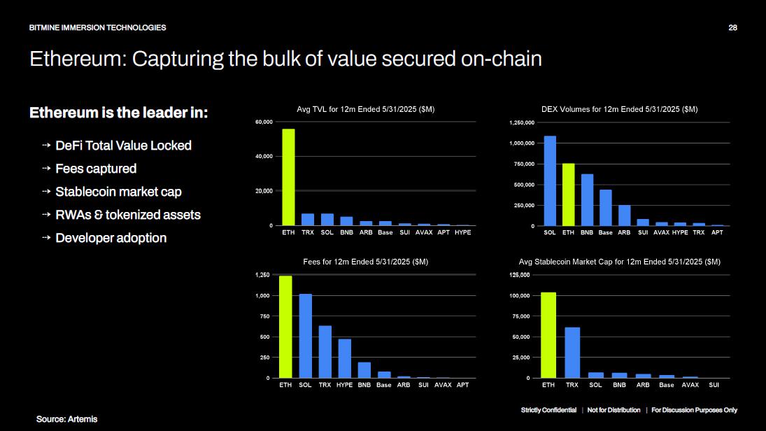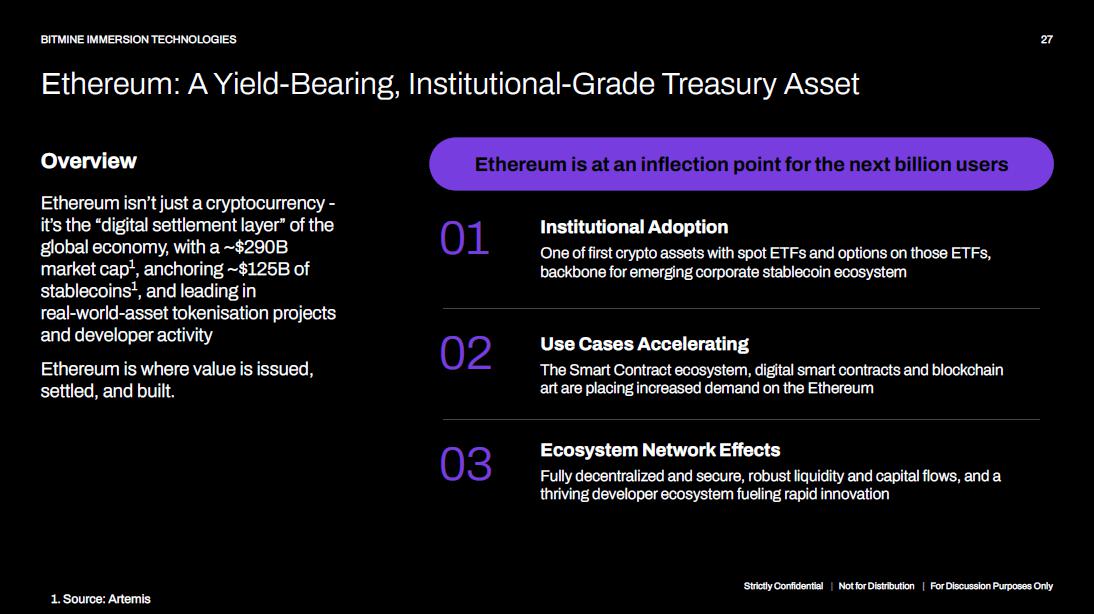 Ethereum: A Yield - Bearing, Institutional - Grade Treasury Asset 27 BITMINE IMMERSION TECHNOLOGIES Ethereum isn’t just a cryptocurrency - it’s the “digital settlement layer” of the global economy, with a ~$290B market cap 1 , anchoring ~$125B of stablecoins 1 , and leading in real - world - asset tokenisation projects and developer activity Ethereum is where value is issued, settled, and built. Overview Institutional Adoption One of first crypto assets with spot ETFs and options on those ETFs, backbone for emerging corporate stablecoin ecosystem Use Cases Accelerating The Smart Contract ecosystem, digital smart contracts and blockchain art are placing increased demand on the Ethereum Ecosystem Network Effects Fully decentralized and secure, robust liquidity and capital flows, and a thriving developer ecosystem fueling rapid innovation 01 02 03 Ethereum is at an inflection point for the next billion users Strictly Confidential | Not for Distribution | For Discussion Purposes Only 1. Source: Artemis