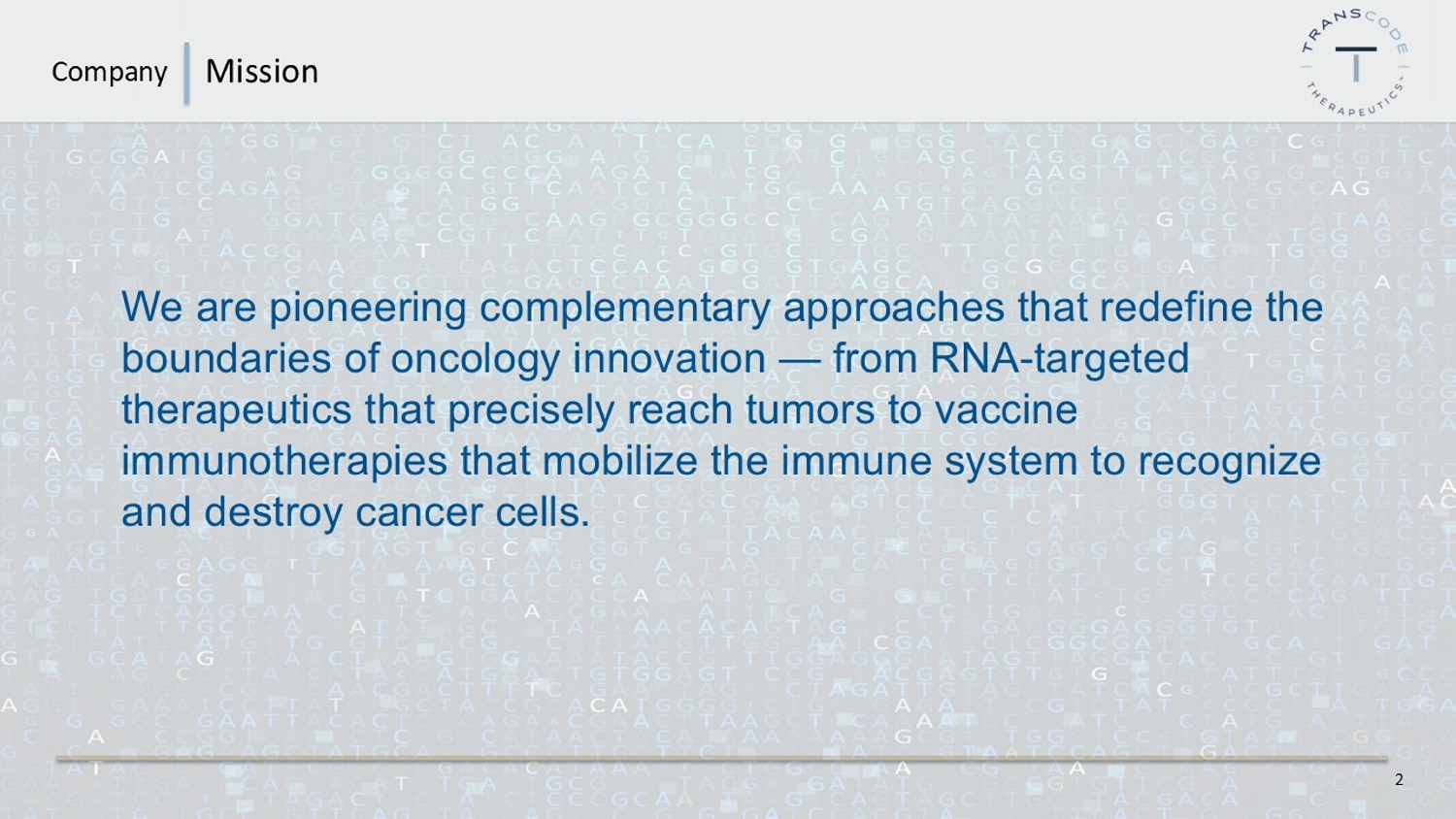 E UNIQUE METASTATIC CANCER AND VACCINE IMMUNO - ONCOLOGY TREATMENT COMPANY TO REDEFINE CANCER CARE NASDAQ: RNAZ Exhibit 99.2