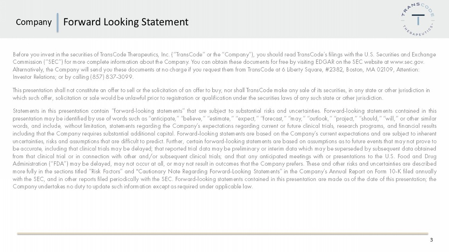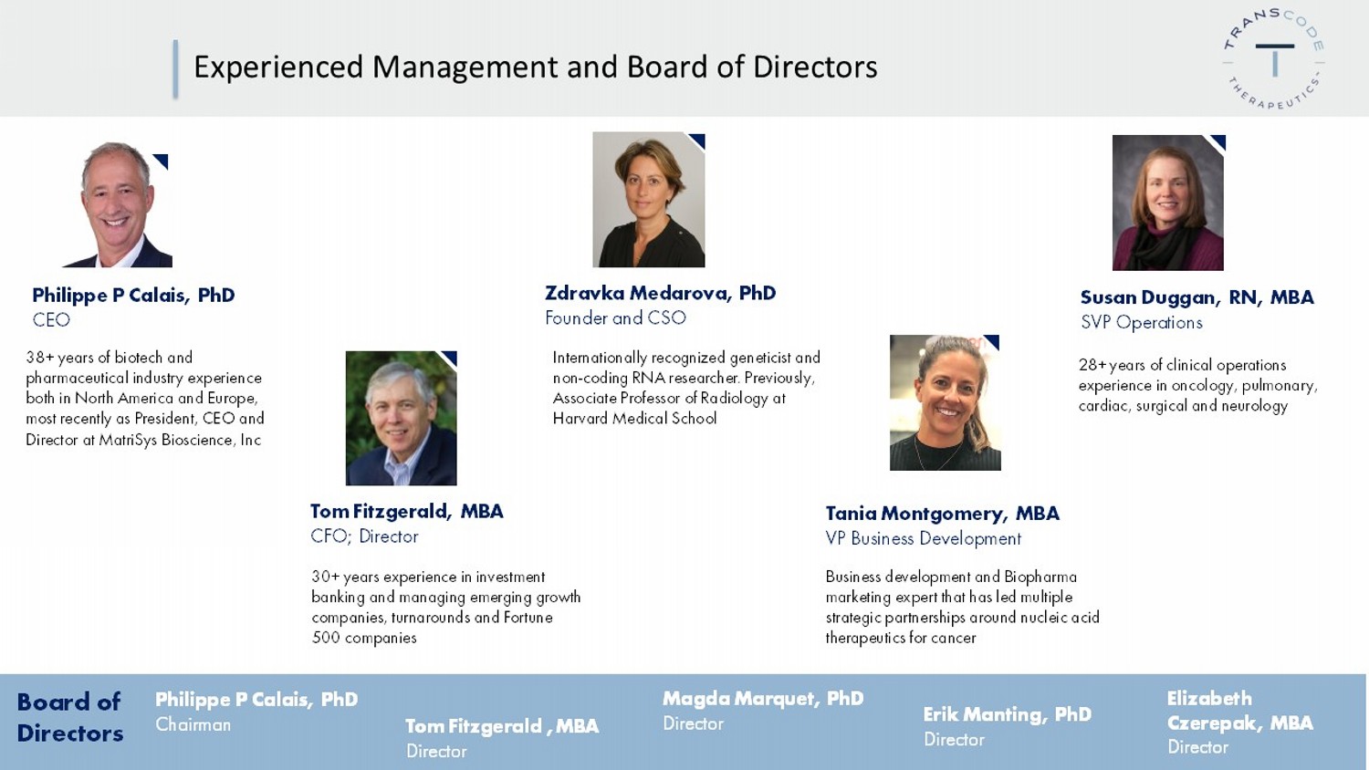 Forward Looking Statement Company 3 Before you invest in the securities of TransCode Therapeutics, Inc. (“ TransCode ” or the “Company”), you should read TransCode’s filings with the U.S. Securities and Exchange Commission (“SEC”) for more complete information about the Company. You can obtain these documents for free by visiting EDGAR on the SEC website at www.sec.gov. Alternatively, the Company will send you these documents at no charge if you request them from TransCode at 6 Liberty Square, #2382, Boston, MA 02109, Attention: Investor Relations; or by calling (857) 837 - 3099. This presentation shall not constitute an offer to sell or the solicitation of an offer to buy, nor shall TransCode make any sale of its securities, in any state or other jurisdiction in which such offer, solicitation or sale would be unlawful prior to registration or qualification under the securities laws of any such state or other jurisdiction. Statements in this presentation contain “forward - looking statements” that are subject to substantial risks and uncertainties . Forward - looking statements contained in this presentation may be identified by use of words such as “anticipate,” “believe,” “estimate,” “expect,” “forecast,” “may,” “outlook,” “project,” “should,” “will,” or other similar words, and include, without limitation, statements regarding the Company’s expectations regarding current or future clinical trials, research programs, and financial results including that the Company requires substantial additional capital . Forward - looking statements are based on the Company’s current expectations and are subject to inherent uncertainties, risks and assumptions that are difficult to predict . Further, certain forward - looking statements are based on assumptions as to future events that may not prove to be accurate, including that clinical trials may be delayed ; that reported trial data may be preliminary or interim data which may be superseded by subsequent data obtained from that clinical trial or in connection with other and/or subsequent clinical trials ; and that any anticipated meetings with or presentations to the U . S . Food and Drug Administration (“FDA”) may be delayed, may not occur at all, or may not result in outcomes that the Company prefers . These and other risks and uncertainties are described more fully in the sections titled “Risk Factors” and "Cautionary Note Regarding Forward - Looking Statements” in the Company’s Annual Report on Form 10 - K filed annually with the SEC, and in other reports filed periodically with the SEC . Forward - looking statements contained in this presentation are made as of the date of this presentation ; the Company undertakes no duty to update such information except as required under applicable law .