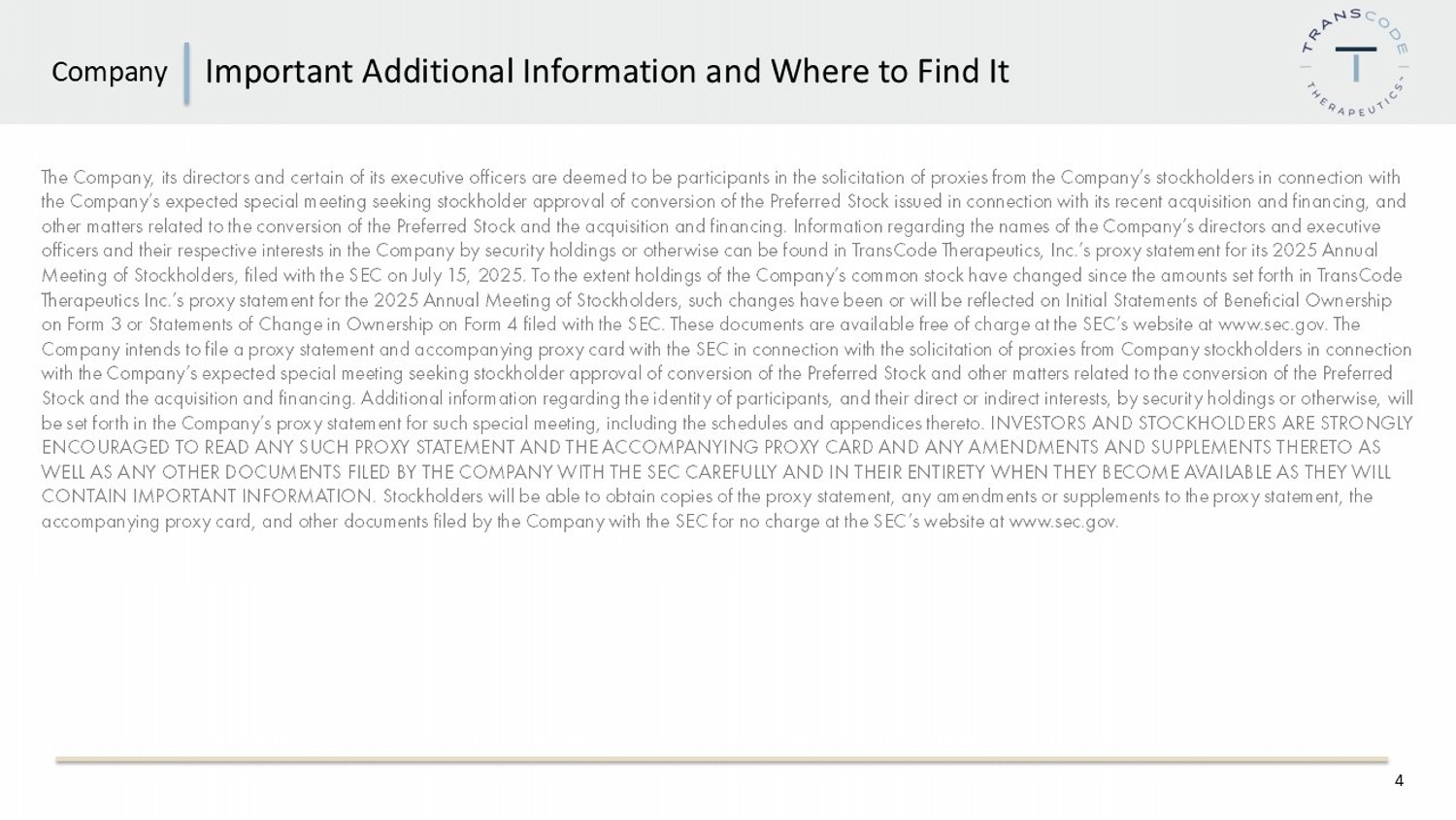 Important Additional Information and Where to Find It Company 4 The Company, its directors and certain of its executive officers are deemed to be participants in the solicitation of proxies fr om the Company’s stockholders in connection with the Company’s expected special meeting seeking stockholder approval of conversion of the Preferred Stock issued in connection wi th its recent acquisition and financing, and other matters related to the conversion of the Preferred Stock and the acquisition and financing. Information regarding the n ame s of the Company’s directors and executive officers and their respective interests in the Company by security holdings or otherwise can be found in TransCode Therapeutics, Inc.’s proxy statement for its 2025 Annual Meeting of Stockholders, filed with the SEC on July 15, 2025. To the extent holdings of the Company’s common stock have chang ed since the amounts set forth in TransCode Therapeutics Inc.’s proxy statement for the 2025 Annual Meeting of Stockholders, such changes have been or will be reflected on Initial Statements of Beneficial Ownership on Form 3 or Statements of Change in Ownership on Form 4 filed with the SEC. These documents are available free of charge at the SEC’s website at www.sec.gov . The Company intends to file a proxy statement and accompanying proxy card with the SEC in connection with the solicitation of pro xie s from Company stockholders in connection with the Company’s expected special meeting seeking stockholder approval of conversion of the Preferred Stock and other matte rs related to the conversion of the Preferred Stock and the acquisition and financing. Additional information regarding the identity of participants, and their direct or i ndi rect interests, by security holdings or otherwise, will be set forth in the Company’s proxy statement for such special meeting, including the schedules and appendices thereto. INVES TOR S AND STOCKHOLDERS ARE STRONGLY ENCOURAGED TO READ ANY SUCH PROXY STATEMENT AND THE ACCOMPANYING PROXY CARD AND ANY AMENDMENTS AND SUPPLEMENTS THERETO AS WELL AS ANY OTHER DOCUMENTS FILED BY THE COMPANY WITH THE SEC CAREFULLY AND IN THEIR ENTIRETY WHEN THEY BECOME AVAILABLE AS T HEY WILL CONTAIN IMPORTANT INFORMATION. Stockholders will be able to obtain copies of the proxy statement, any amendments or supplemen ts to the proxy statement, the accompanying proxy card, and other documents filed by the Company with the SEC for no charge at the SEC’s website at www.sec.gov .