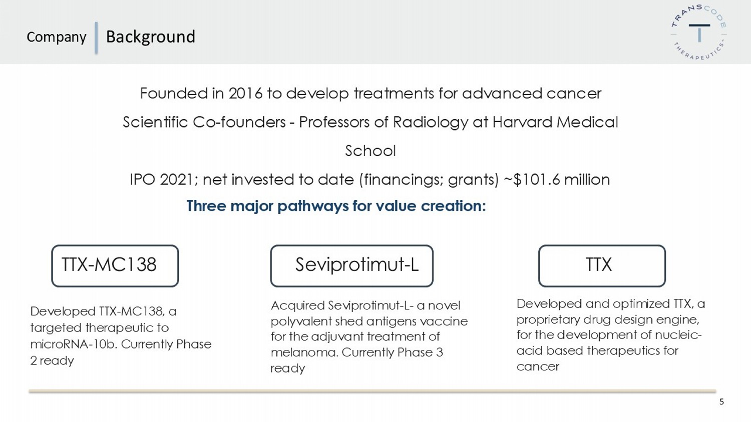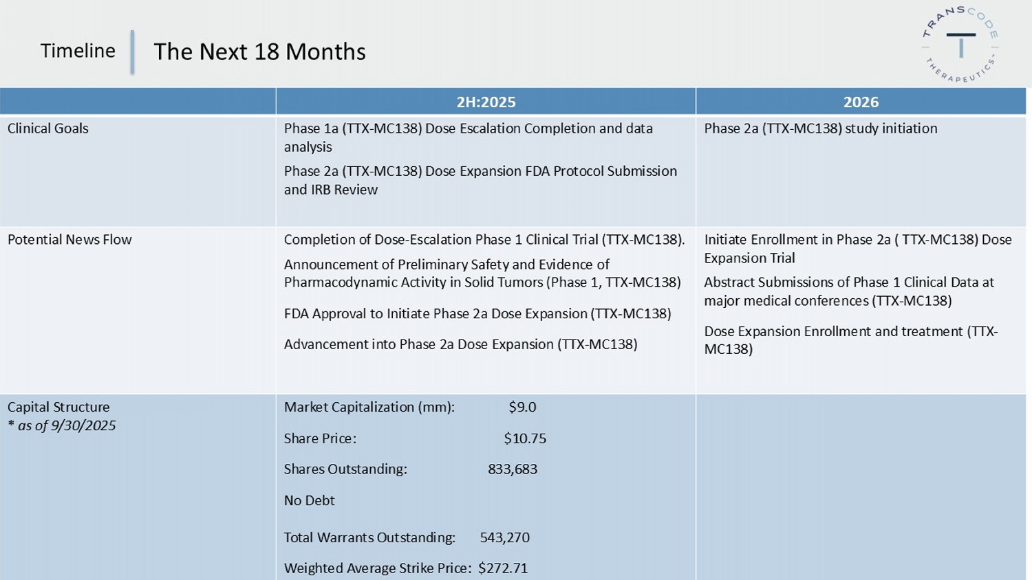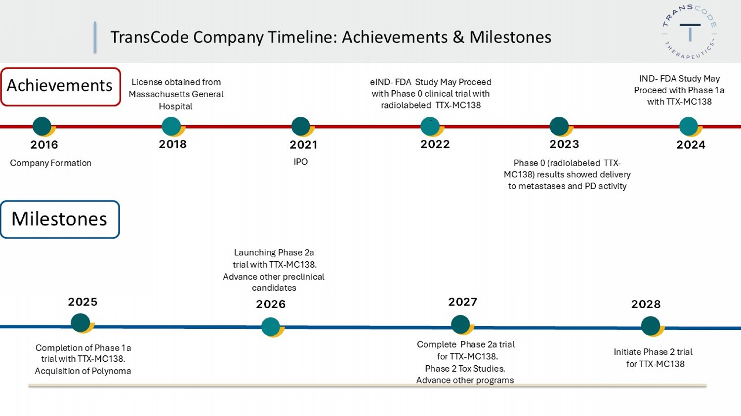 TransCode Company Timeline: Achievements & Milestones 2016 Company Formation License obtained from Massachusetts General Hospital eIND - FDA Study May Proceed with Phase 0 clinical trial with radiolabeled TTX - MC138 . IND - FDA Study May Proceed with Phase 1a with TTX - MC138 Phase 0 (radiolabeled TTX - MC138) results showed delivery to metastases and PD activity Completion of Phase 1a trial with TTX - MC138. Acquisition of Polynoma Launching Phase 2a trial with TTX - MC138. Advance other preclinical candidates 2018 2021 2022 2023 2024 Initiate Phase 2 trial for TTX - MC138 Complete Phase 2a trial for TTX - MC138. Phase 2 Tox Studies . Advance other programs IPO 2025 2026 2027 2028 Milestones Achievements