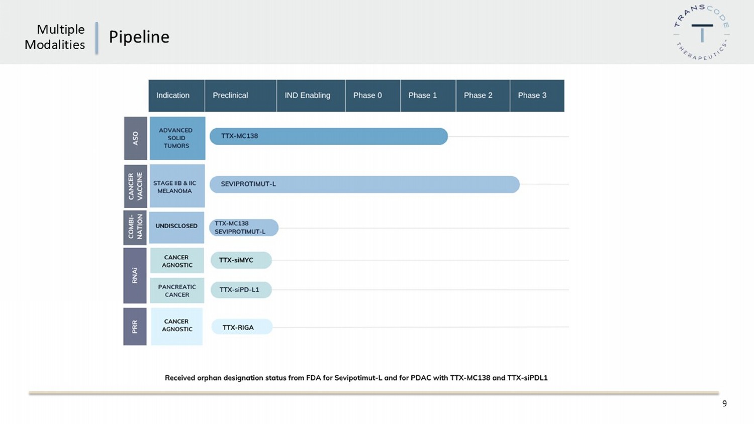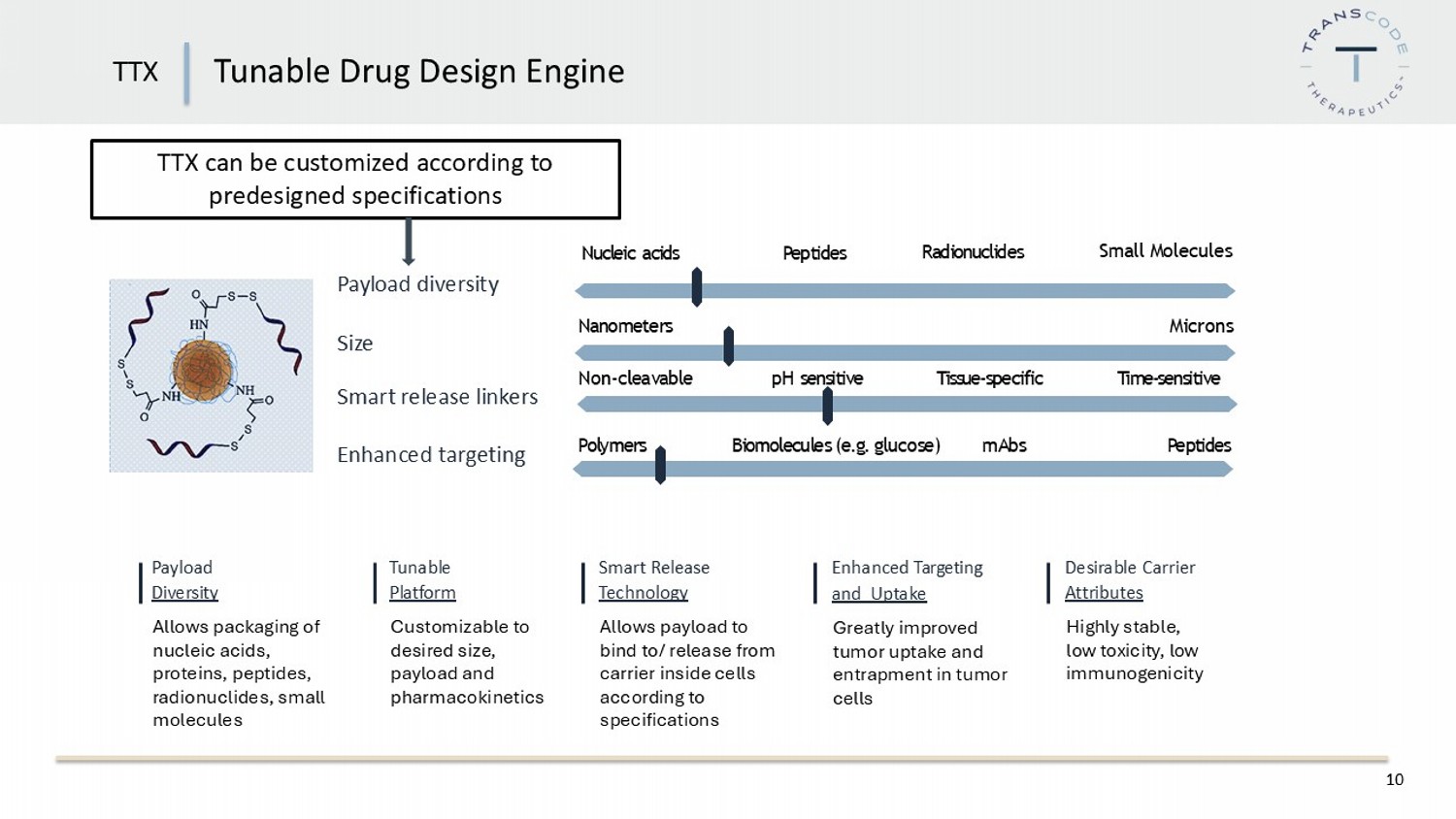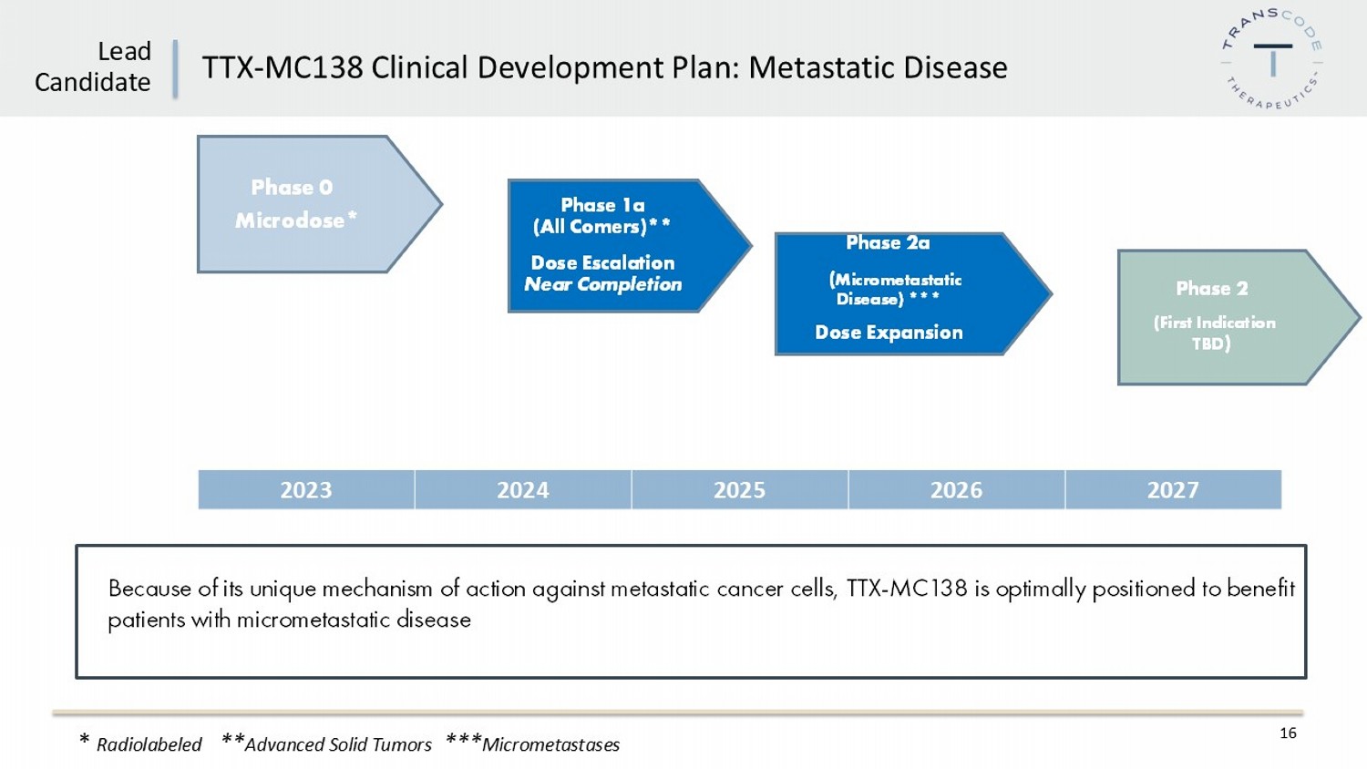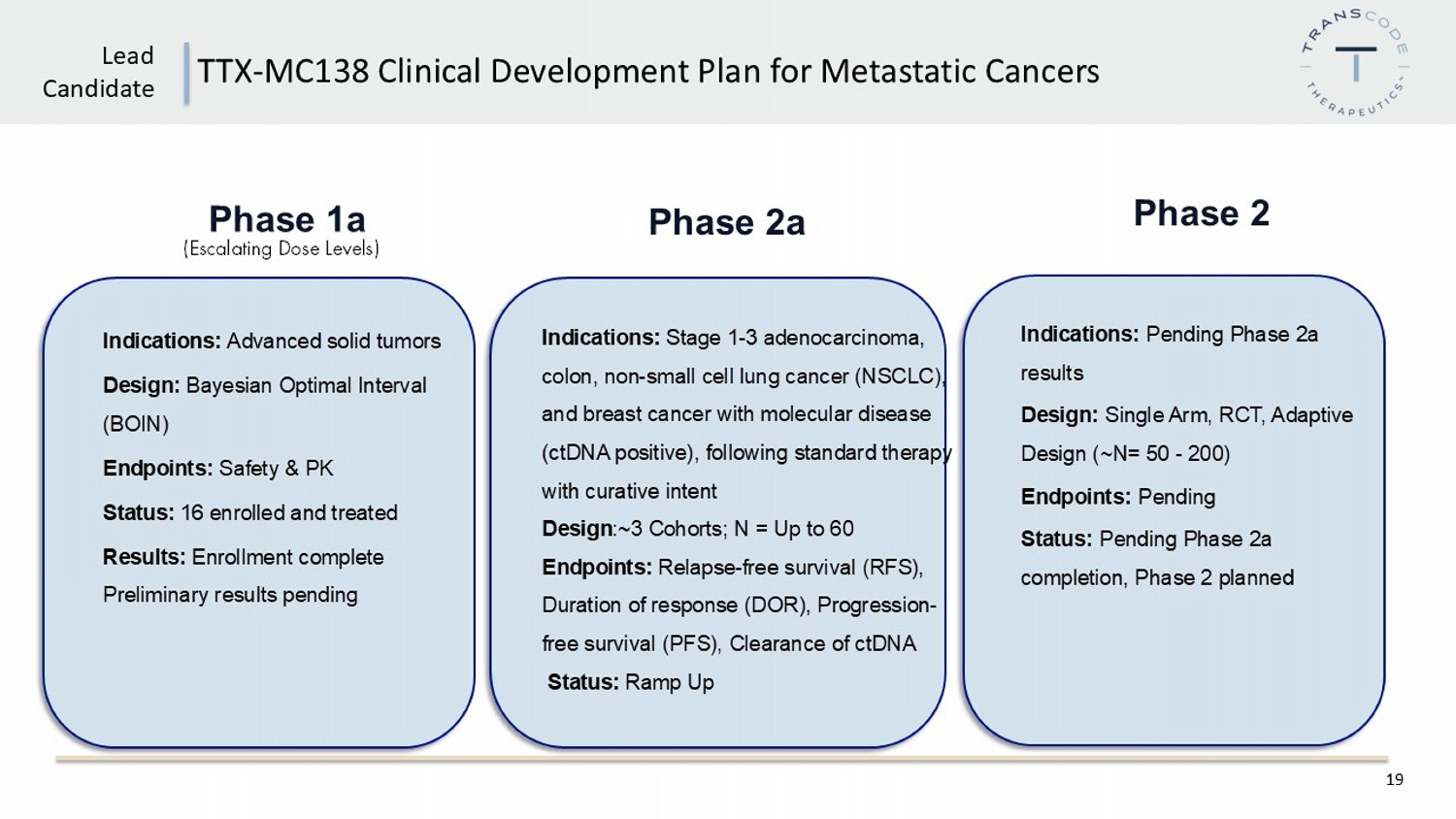 TransCode Company Timeline: Achievements & Milestones 2016 Company Formation License obtained from Massachusetts General Hospital eIND - FDA Study May Proceed with Phase 0 clinical trial with radiolabeled TTX - MC138 . IND - FDA Study May Proceed with Phase 1a with TTX - MC138 Phase 0 (radiolabeled TTX - MC138) results showed delivery to metastases and PD activity Completion of Phase 1a trial with TTX - MC138. Acquisition of Polynoma Launching Phase 2a trial with TTX - MC138. Advance other preclinical candidates 2018 2021 2022 2023 2024 Initiate Phase 2 trial for TTX - MC138 Complete Phase 2a trial for TTX - MC138. Phase 2 Tox Studies . Advance other programs IPO 2025 2026 2027 2028 Milestones Achievements