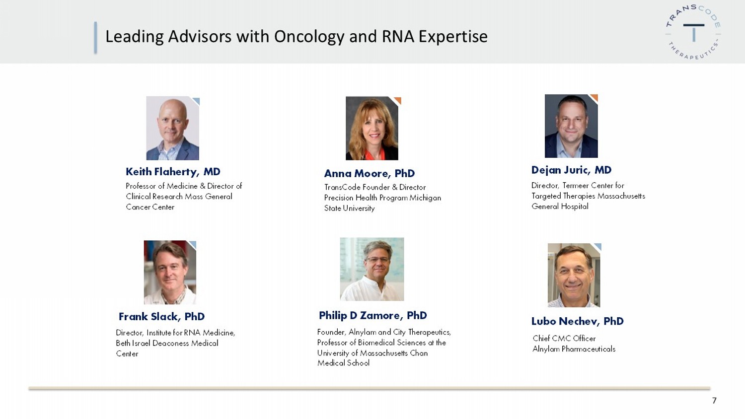 Experienced Management and Board of Directors 6 Tom Fitzgerald, MBA CFO; Director 30+ years experience in investment banking and managing emerging growth companies, turnarounds and Fortune 500 companies Zdravka Medarova , PhD Founder and CSO Internationally recognized geneticist and non - coding RNA researcher. Previously, Associate Professor of Radiology at Harvard Medical School Susan Duggan, RN, MBA SVP Operations 28+ years of clinical operations experience in oncology, pulmonary, cardiac, surgical and neurology Tania Montgomery, MBA VP Business Development Business development and Biopharma marketing expert that has led multiple strategic partnerships around nucleic acid therapeutics for cancer Board of Directors Philippe P Calais, PhD CEO Magda Marquet , PhD ​ Director Erik Manting , PhD ​ Director Philippe P Calais, PhD ​ Chairman Elizabeth Czerepak, MBA ​ Director 38+ years of biotech and pharmaceutical industry experience both in North America and Europe, most recently as President, CEO and Director at MatriSys Bioscience, Inc Tom Fitzgerald ,MBA Director