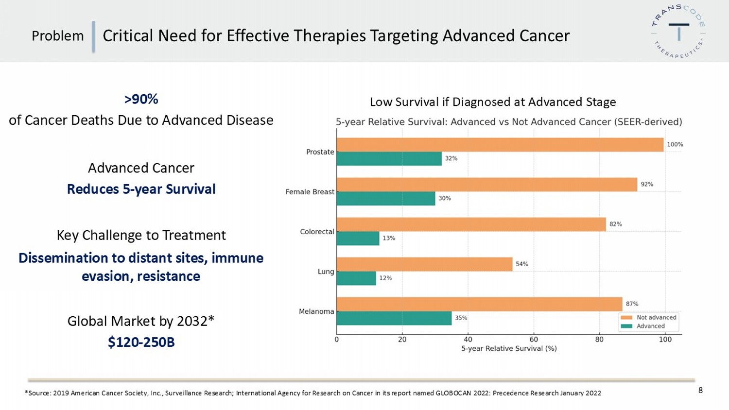 Leading Advisors with Oncology and RNA Expertise 7 Keith Flaherty, MD Professor of Medicine & Director of Clinical Research Mass General Cancer Center Lubo Nechev , PhD Chief CMC Officer Alnylam Pharmaceuticals Dejan Juric , MD Director, Termeer Center for Targeted Therapies Massachusetts General Hospital Director, Institute for RNA Medicine, Beth Israel Deaconess Medical Center Philip D Zamore, PhD Founder, Alnylam and City Therapeutics, Professor of Biomedical Sciences at the University of Massachusetts Chan Medical School Anna Moore, PhD TransCode Founder & Director Precision Health Program Michigan State University Frank Slack, PhD
