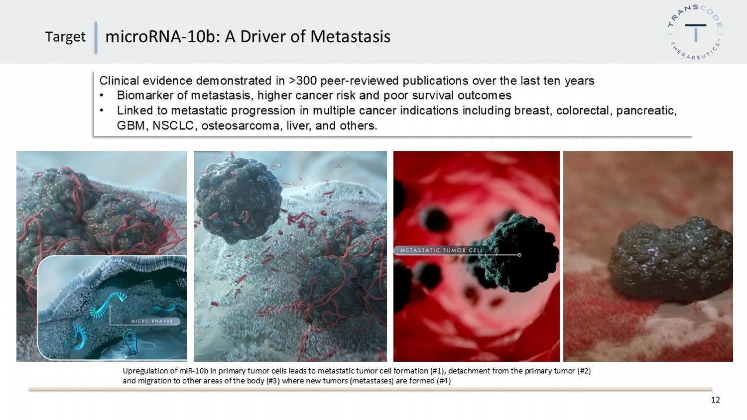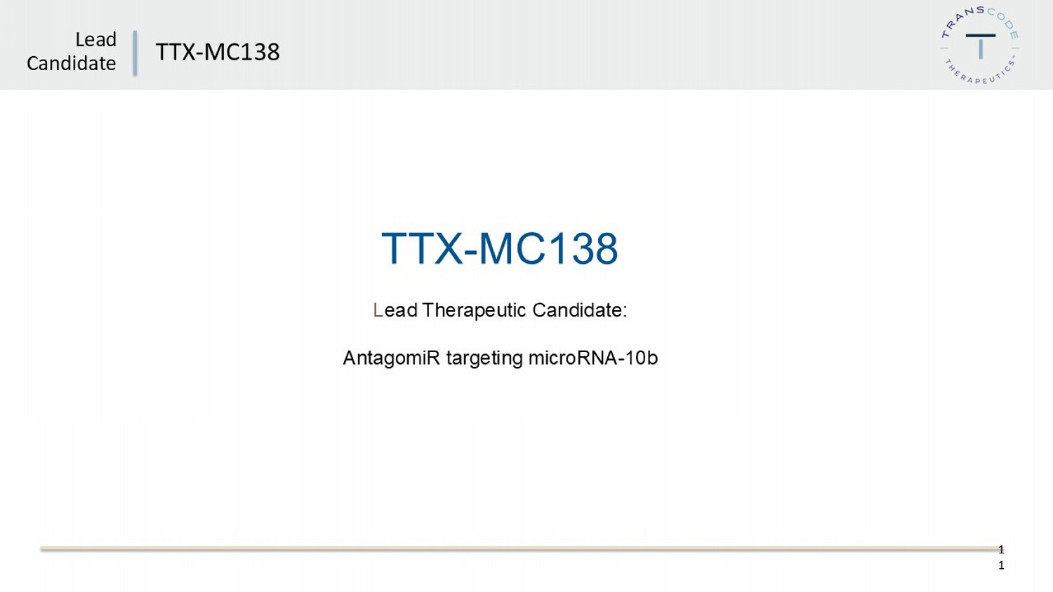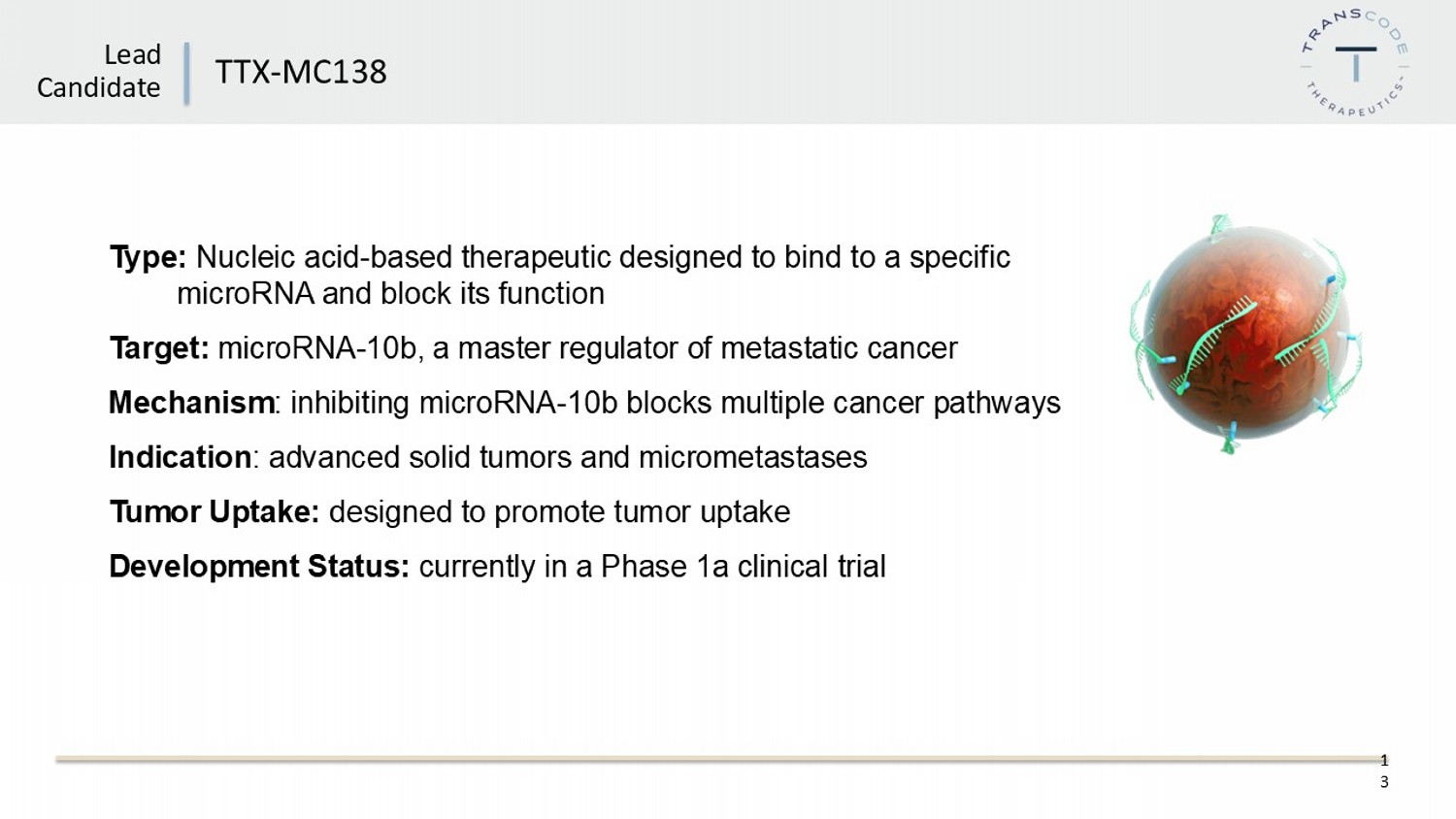 TTX - MC138 Lead Candidate 1 3 Type: Nucleic acid - based therapeutic designed to bind to a specific microRNA and block its function Target: microRNA - 10b, a master regulator of metastatic cancer Mechanism : inhibiting microRNA - 10b blocks multiple cancer pathways Indication : advanced solid tumors and micrometastases Tumor Uptake: designed to promote tumor uptake Development Status: currently in a Phase 1a clinical trial