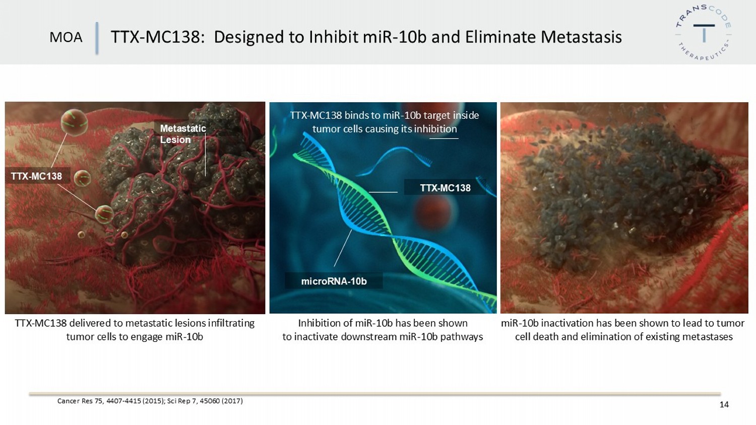 TTX - MC138: Designed to Inhibit miR - 10b and Eliminate Metastasis MOA Cancer Res 75, 4407 - 4415 (2015); Sci Rep 7, 45060 (2017) TTX - MC138 microRNA - 10b TTX - MC138 binds to miR - 10b target inside tumor cells causing its inhibition TTX - MC138 Metastatic Lesion Inhibition of miR - 10b has been shown to inactivate downstream miR - 10b pathways TTX - MC138 delivered to metastatic lesions infiltrating tumor cells to engage miR - 10b 14 miR - 10b inactivation has been shown to lead to tumor cell death and elimination of existing metastases