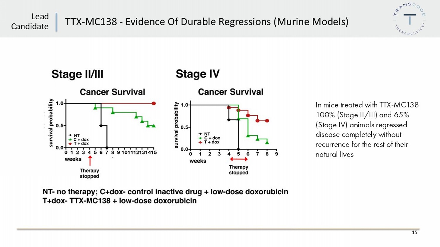 TTX - MC138 - Evidence Of Durable Regressions (Murine Models) Lead Candidate 15 In mice treated with TTX - MC138 100% (Stage II/III) and 65% (Stage IV) animals regressed disease completely without recurrence for the rest of their natural lives