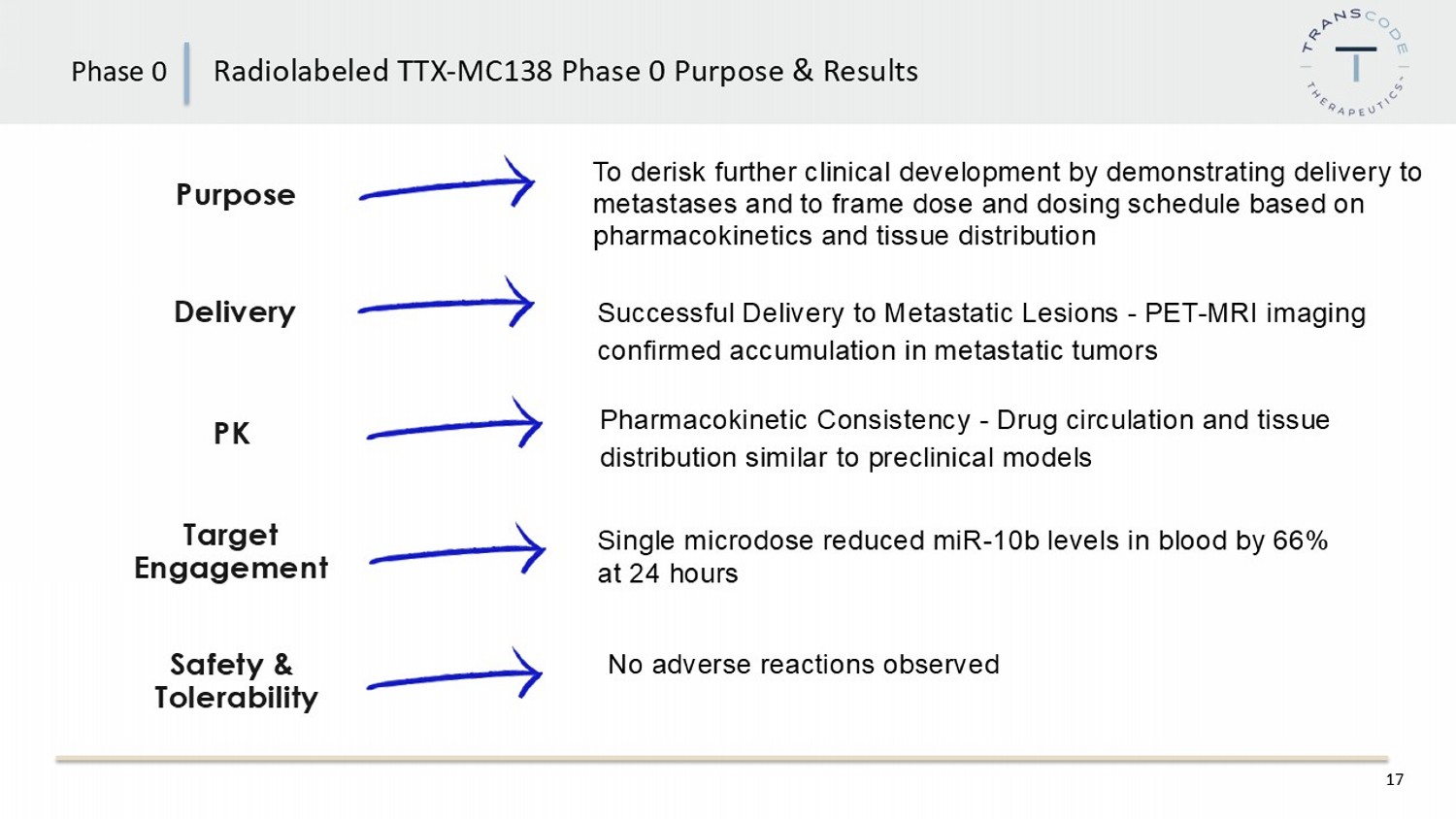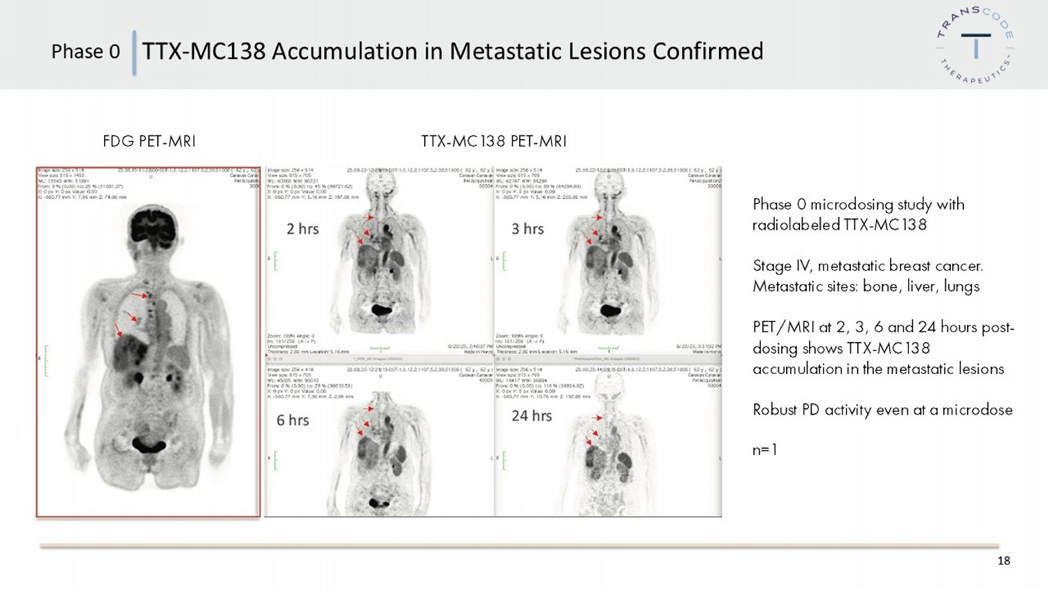 Radiolabeled TTX - MC138 Phase 0 Purpose & Results Phase 0 17 Delivery PK Target Engagement Safety & Tolerability Successful Delivery to Metastatic Lesions - PET - MRI imaging confirmed accumulation in metastatic tumors Pharmacokinetic Consistency - Drug circulation and tissue distribution similar to preclinical models No adverse reactions observed Single microdose reduced miR - 10b levels in blood by 66% at 24 hours Purpose To derisk further clinical development by demonstrating delivery to metastases and to frame dose and dosing schedule based on pharmacokinetics and tissue distribution