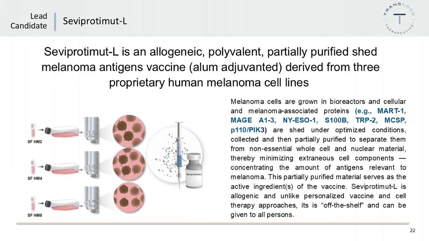 Seviprotimut - L Lead Candidate 22 Seviprotimut - L is an allogeneic, polyvalent, partially purified shed melanoma antigens vaccine (alum adjuvanted) derived from three proprietary human melanoma cell lines Melanoma cells are grown in bioreactors and cellular and melanoma - associated proteins (e . g . , MART - 1 , MAGE A 1 - 3 , NY - ESO - 1 , S 100 B, TRP - 2 , MCSP, p 110 /PIK 3 ) are shed under optimized conditions, collected and then partially purified to separate them from non - essential whole cell and nuclear material, thereby minimizing extraneous cell components — concentrating the amount of antigens relevant to melanoma . This partially purified material serves as the active ingredient(s) of the vaccine . Seviprotimut - L is allogenic and unlike personalized vaccine and cell therapy approaches, its is “off - the - shelf” and can be given to all persons .