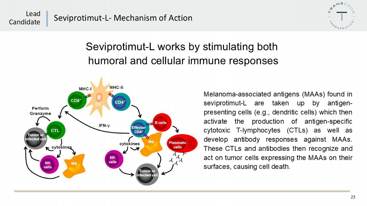 Seviprotimut - L - Mechanism of Action Lead Candidate 23 Melanoma - associated antigens (MAAs) found in seviprotimut - L are taken up by antigen - presenting cells (e . g . , dendritic cells) which then activate the production of antigen - specific cytotoxic T - lymphocytes (CTLs) as well as develop antibody responses against MAAs . These CTLs and antibodies then recognize and act on tumor cells expressing the MAAs on their surfaces, causing cell death . Seviprotimut - L works by stimulating both humoral and cellular immune responses