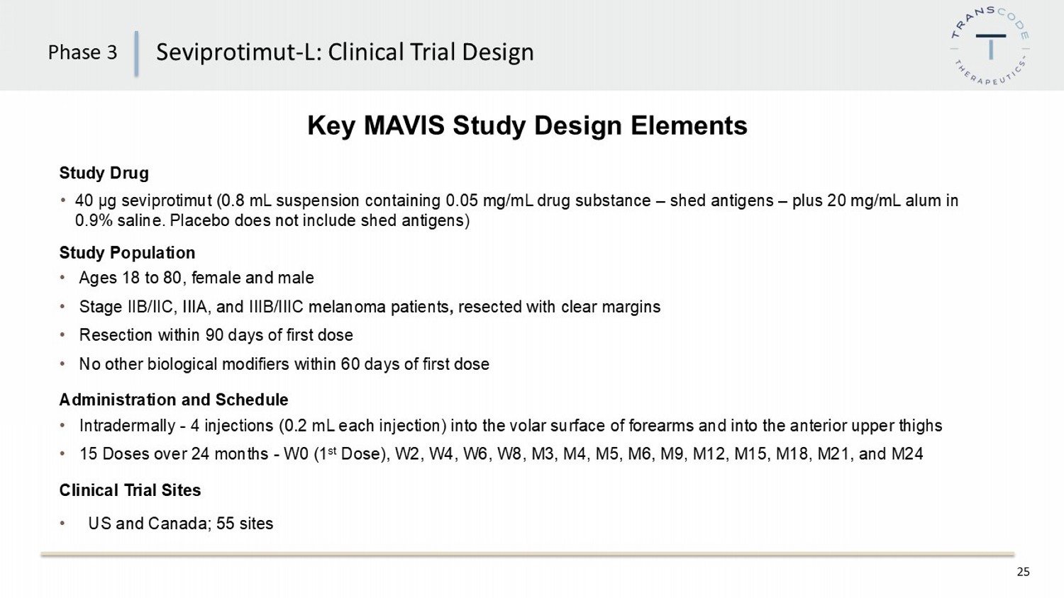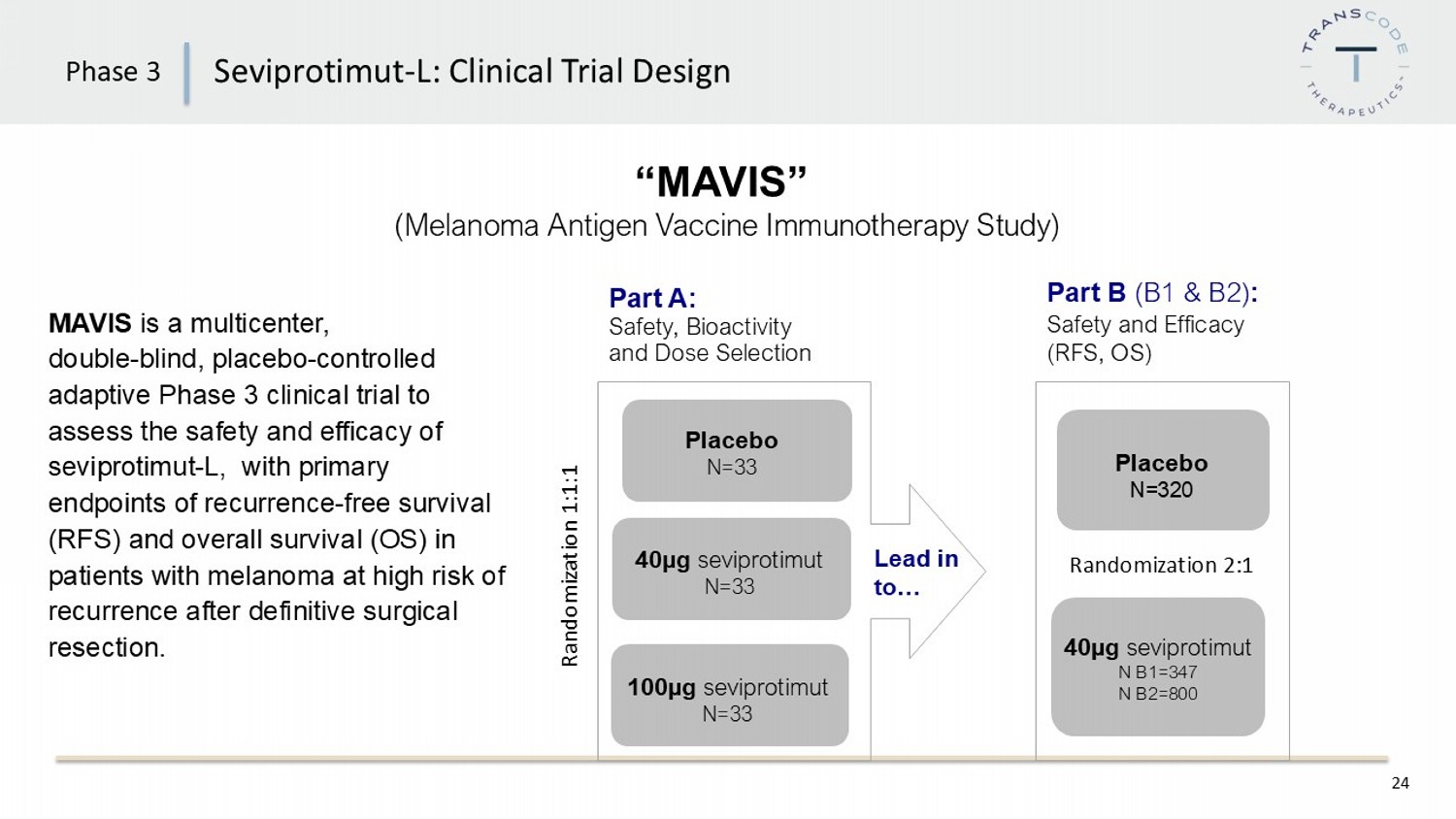 Seviprotimut - L: Clinical Trial Design Phase 3 24 40µg seviprotimut N=33 Randomization 1:1:1 Lead in to… 100µg seviprotimut N=33 Placebo N=33 Part A: Safety, Bioactivity and Dose Selection Part B (B1 & B2) : Safety and Efficacy (RFS, OS) Randomization 2:1 40µg seviprotimut N B1=347 N B2=800 Placebo N=320 MAVIS is a multicenter, double - blind, placebo - controlled adaptive Phase 3 clinical trial to assess the safety and efficacy of seviprotimut - L, with primary endpoints of recurrence - free survival (RFS) and overall survival (OS) in patients with melanoma at high risk of recurrence after definitive surgical resection. “MAVIS” (Melanoma Antigen Vaccine Immunotherapy Study)