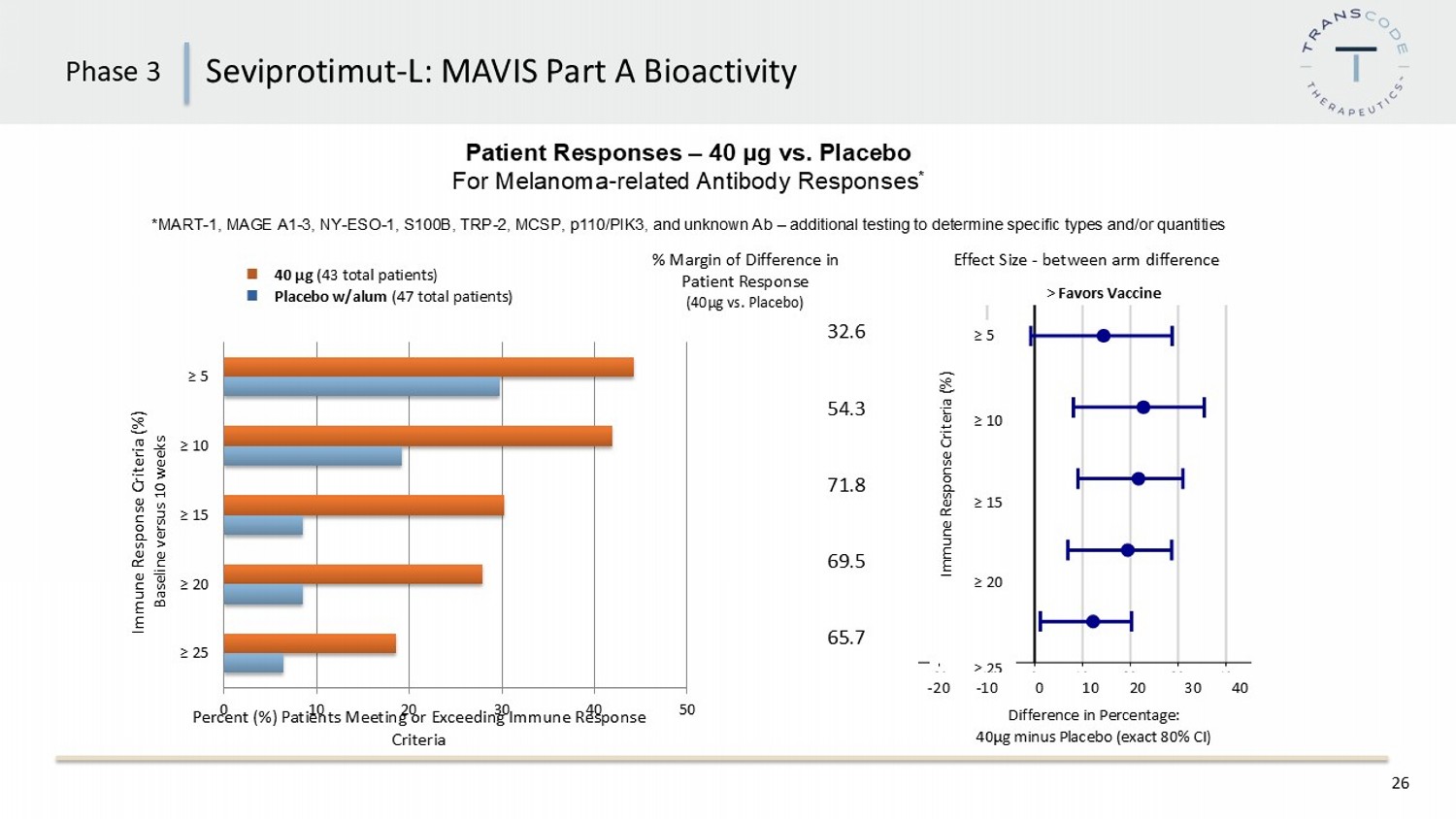 Seviprotimut - L: Clinical Trial Design Phase 3 25 Key MAVIS Study Design Elements Study Drug • 40 µg seviprotimut (0.8 mL suspension containing 0.05 mg/mL drug substance – shed antigens – plus 20 mg/mL alum in 0.9% saline. Placebo does not include shed antigens) Study Population • Ages 18 to 80, female and male • Stage IIB/IIC, IIIA, and IIIB/IIIC melanoma patients , resected with clear margins • Resection within 90 days of first dose • No other biological modifiers within 60 days of first dose Administration and Schedule • Intradermally - 4 injections (0.2 mL each injection) into the volar surface of forearms and into the anterior upper thighs • 15 Doses over 24 months - W0 (1 st Dose), W2, W4, W6, W8, M3, M4, M5, M6, M9, M12, M15, M18, M21, and M24 Clinical Trial Sites • US and Canada; 55 sites
