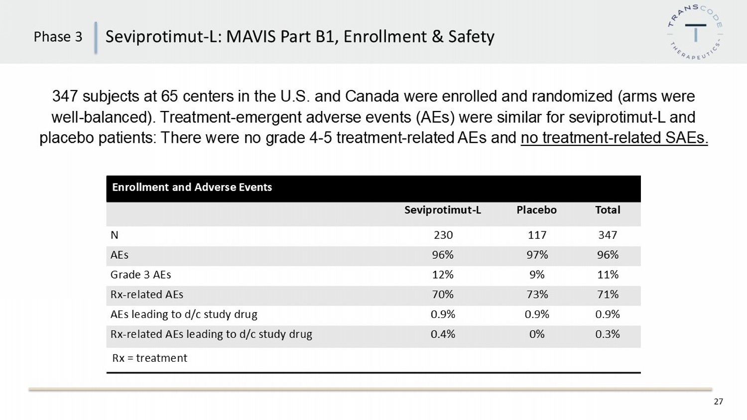 Seviprotimut - L: MAVIS Part A Bioactivity Phase 3 26 0 10 20 30 40 50 ≥ 25 ≥ 20 ≥ 15 ≥ 10 ≥ 5 Percent (%) Patients Meeting or Exceeding Immune Response Criteria Immune Response Criteria (%) Baseline versus 10 weeks Difference of Percents: Experimental minus Control (exact 80% CI) -30 -20 -10 0 10 20 30 40 50 Patient Responses: 40 ug versus Placebo Response: Average % Change Over Selected Bins >= Criterion Selected Bins: 1 2 3 6 9 12 > Favors VaccineCriterion Between-Arm Response Difference 0 (21/43 - 15/47): (48.8 - 31.9) = 16.9 5 (19/43 - 14/47): (44.2 - 29.8) = 14.4 10 (18/43 - 9/47): (41.9 - 19.1) = 22.7 15 (13/43 - 4/47): (30.2 - 8.5) = 21.7 20 (12/43 - 4/47): (27.9 - 8.5) = 19.4 25 (8/43 - 3/47): (18.6 - 6.4) = 12.2 ≥ 5 ≥ 10 ≥ 15 ≥ 20 ≥ 25 Immune Response Criteria (%) Difference in Percentage: 40µg minus Placebo (exact 80% CI) Effect Size - between arm difference > Favors Vaccine - 20 - 10 0 10 20 30 40 % Margin of Difference in Patient Response (40µg vs. Placebo) 40 µg (43 total patients) Placebo w/alum (47 total patients) 32.6 54.3 71.8 69.5 65.7 Patient Responses – 40 µg vs. Placebo For Melanoma - related Antibody Responses * *MART - 1, MAGE A1 - 3, NY - ESO - 1, S100B, TRP - 2, MCSP, p110/PIK3, and unknown Ab – additional testing to determine specific types and /or quantities