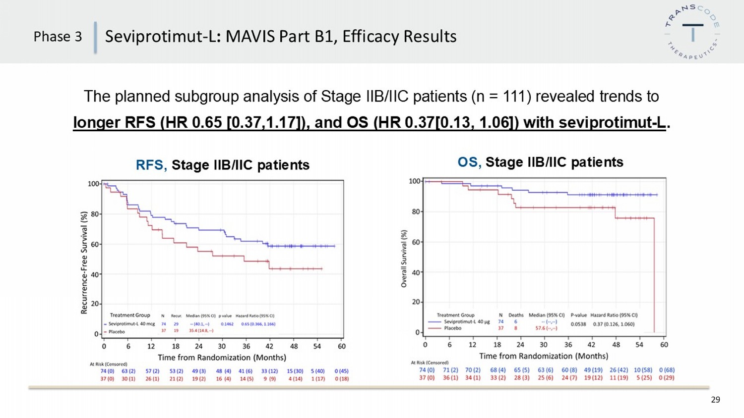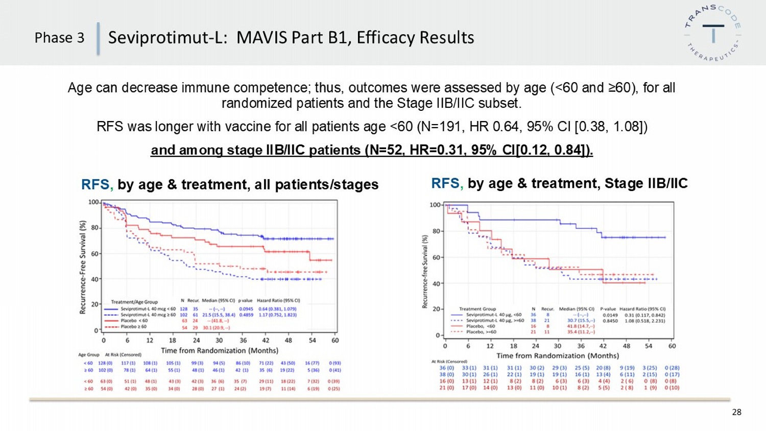 Seviprotimut - L: MAVIS Part B1, Efficacy Results Phase 3 28 Age can decrease immune competence; thus, outcomes were assessed by age (<60 and ≥60), for all randomized patients and the Stage IIB/IIC subset. RFS was longer with vaccine for all patients age <60 (N=191, HR 0.64, 95% CI [0.38, 1.08]) and among stage IIB/IIC patients (N=52, HR=0.31, 95% CI[0.12, 0.84]). RFS , by age & treatment, all patients/stages RFS , by age & treatment, Stage IIB/IIC