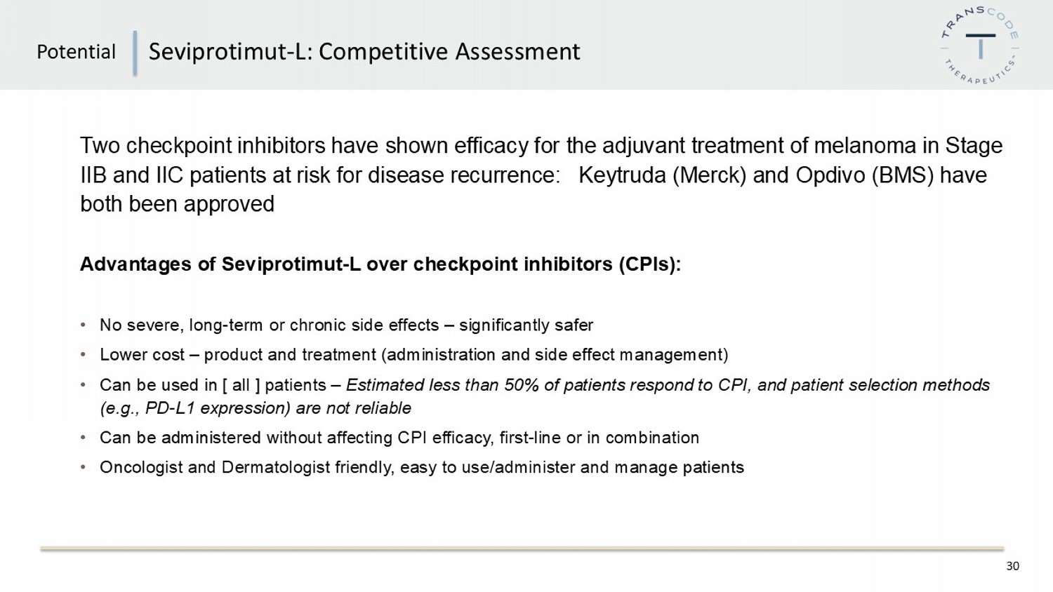 Seviprotimut - L: Competitive Assessment Potential 30 Two checkpoint inhibitors have shown efficacy for the adjuvant treatment of melanoma in Stage IIB and IIC patients at risk for disease recurrence: Keytruda (Merck) and Opdivo (BMS) have both been approved Advantages of Seviprotimut - L over checkpoint inhibitors (CPIs): • No severe, long - term or chronic side effects – significantly safer • Lower cost – product and treatment (administration and side effect management) • Can be used in [ all ] patients – Estimated less than 50% of patients respond to CPI, and patient selection methods (e.g., PD - L1 expression) are not reliable • Can be administered without affecting CPI efficacy, first - line or in combination • Oncologist and Dermatologist friendly, easy to use/administer and manage patients