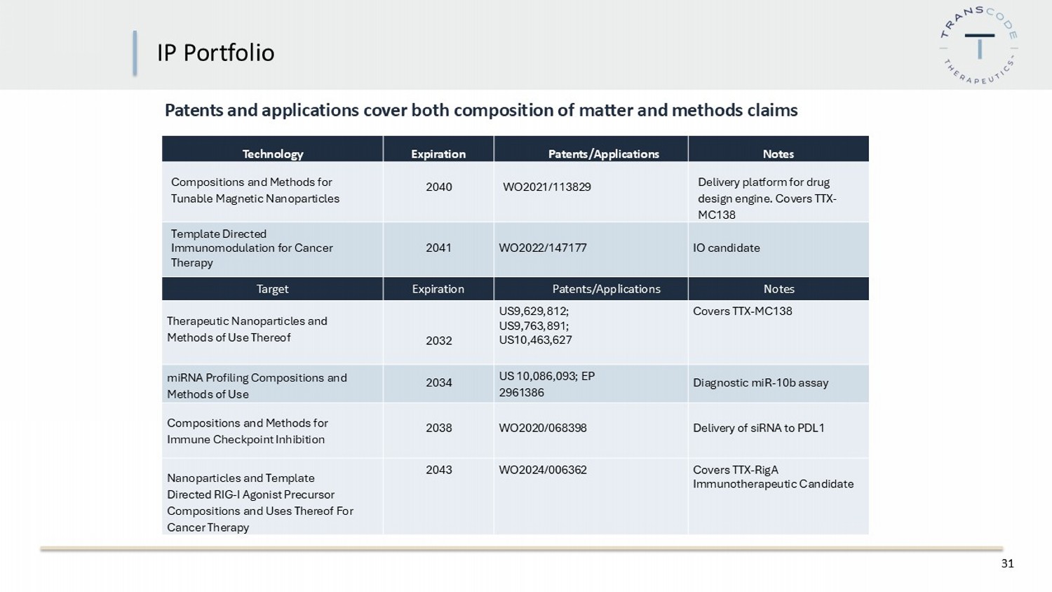 IP Portfolio 31 Notes Patents/Applications Expiration Technology Delivery platform for drug design engine . Covers TTX - MC138 WO2021/113829 2040 Compositions and Methods for Tunable Magnetic Nanoparticles IO candidate WO2022/147177 2041 Template Directed Immunomodulation for Cancer Therapy Notes Patents/Applications Expiration Target Covers TTX - MC138 US 9 , 629 , 812 ; US 9 , 763 , 891 ; US 10 , 463 , 627 2032 Therapeutic Nanoparticles and Methods of Use Thereof Diagnostic miR - 10b assay US 10,086,093; EP 2961386 2034 miRNA Profiling Compositions and Methods of Use Delivery of siRNA to PDL1 WO2020/068398 2038 Compositions and Methods for Immune Checkpoint Inhibition Covers TTX - RigA Immunotherapeutic Candidate WO2024/006362 2043 Nanoparticles and Template Directed RIG - I Agonist Precursor Compositions and Uses Thereof For Cancer Therapy Patents and a pplications cover both composition of matter and methods claims