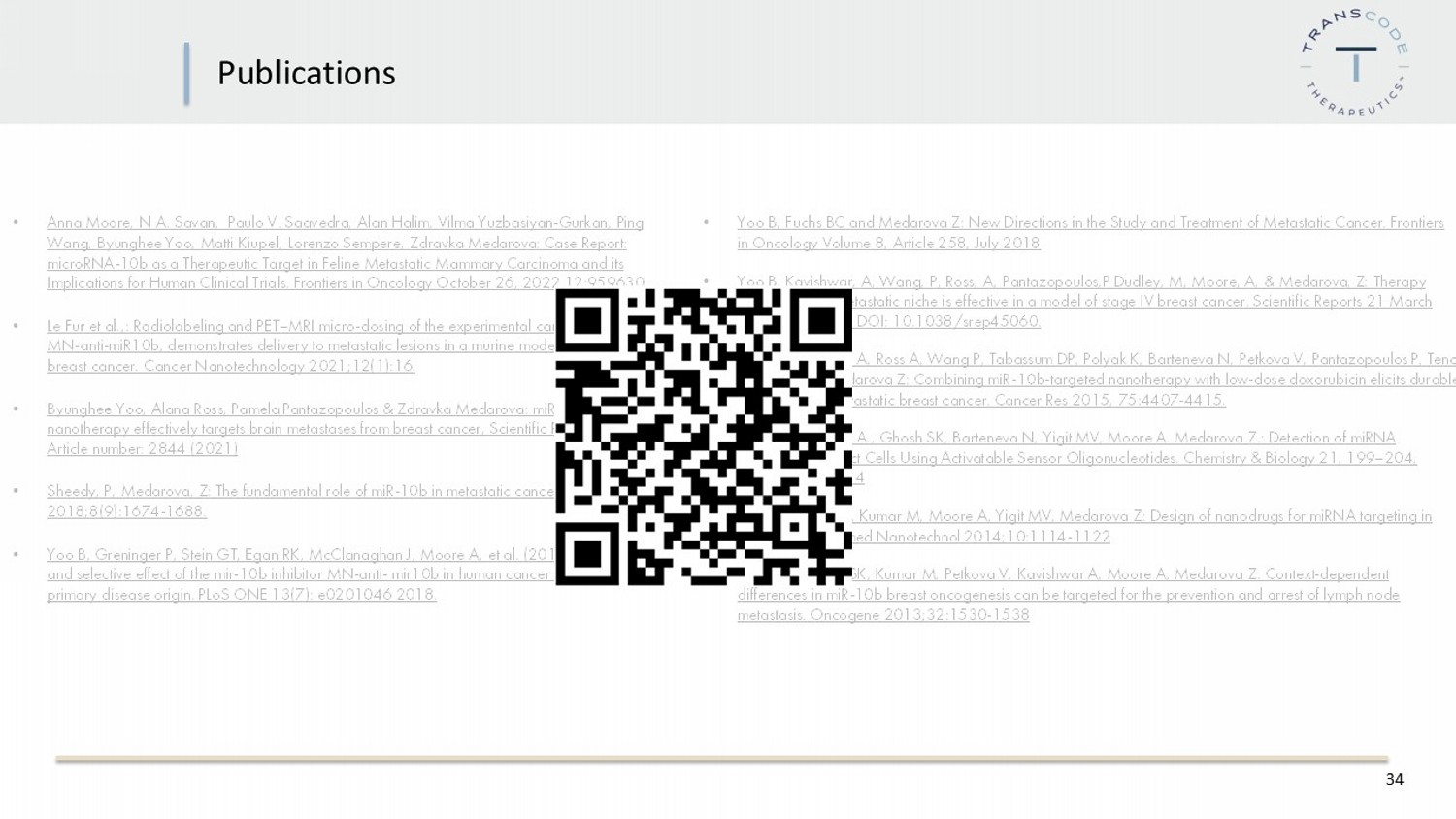 Publications 34 • Yoo B, Fuchs BC and Medarova Z: New Directions in the Study and Treatment of Metastatic Cancer. Frontiers in Oncology Volume 8, Article 258, July 2018 • Yoo B, Kavishwar , A, Wang, P, Ross, A, Pantazopoulos,P Dudley, M, Moore, A, & Medarova , Z: Therapy targeted to the metastatic niche is effective in a model of stage IV breast cancer. Scientific Reports 21 March 2017 7:45060 | DOI: 10.1038/srep45060. • Yoo B, Kavishwar A, Ross A, Wang P, Tabassum DP, Polyak K, Barteneva N, Petkova V, Pantazopoulos P, Tena A, Moore A, Medarova Z: Combining miR - 10b - targeted nanotherapy with low - dose doxorubicin elicits durable regressions of metastatic breast cancer. Cancer Res 2015, 75:4407 - 4415. ​ • Yoo B, Kavishwar A., Ghosh SK, Barteneva N, Yigit MV, Moore A. Medarova Z.: Detection of miRNA Expression in Intact Cells Using Activatable Sensor Oligonucleotides. Chemistry & Biology 21, 199 – 204, February 20, 2014 • Yoo B, Ghosh SK, Kumar M, Moore A, Yigit MV, Medarova Z: Design of nanodrugs for miRNA targeting in tumor cells. J Biomed Nanotechnol 2014;10:1114 - 1122 ​ • Yigit MV, Ghosh SK, Kumar M, Petkova V, Kavishwar A, Moore A, Medarova Z: Context - dependent differences in miR - 10b breast oncogenesis can be targeted for the prevention and arrest of lymph node metastasis. Oncogene 2013;32:1530 - 1538 ​​ • Anna Moore, N A. Savan , Paulo V. Saavedra, Alan Halim, Vilma Yuzbasiyan - Gurkan , Ping Wang, Byunghee Yoo , Matti Kiupel , Lorenzo Sempere , Zdravka Medarova : Case Report: microRNA - 10b as a Therapeutic Target in Feline Metastatic Mammary Carcinoma and its Implications for Human Clinical Trials. Frontiers in Oncology October 26, 2022 12:959630 • Le Fur et al.,: Radiolabeling and PET – MRI micro - dosing of the experimental cancer therapeutic, MN - anti - miR10b, demonstrates delivery to metastatic lesions in a murine model of metastatic breast cancer. Cancer Nanotechnology 2021;12(1):16. • Byunghee Yoo , Alana Ross, Pamela Pantazopoulos & Zdravka Medarova : miRNA10b - directed nanotherapy effectively targets brain metastases from breast cancer, Scientific Reports volume 11, Article number: 2844 (2021) • Sheedy, P, Medarova , Z: The fundamental role of miR - 10b in metastatic cancer. Am J Cancer Res 2018;8(9):1674 - 1688. • Yoo B, Greninger P, Stein GT, Egan RK, McClanaghan J, Moore A, et al. (2018) Potent and selective effect of the mir - 10b inhibitor MN - anti - mir10b in human cancer cells of diverse primary disease origin. PLoS ONE 13(7): e0201046 2018.