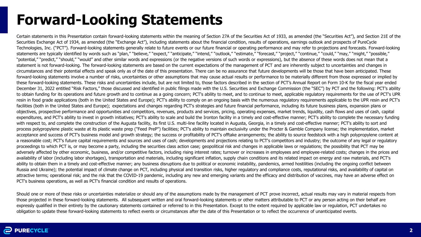 2 Forward-Looking Statements Certain statements in this Presentation contain forward-looking statements within the meaning of Section 27A of the Securities Act of 1933, as amended (the “Securities Act”), and Section 21E of the Securities Exchange Act of 1934, as amended (the “Exchange Act”), including statements about the financial condition, results of operations, earnings outlook and prospects of PureCycle Technologies, Inc. (“PCT”). Forward-looking statements generally relate to future events or our future financial or operating performance and may refer to projections and forecasts. Forward-looking statements are typically identified by words such as “plan,” “believe,” “expect,” “anticipate,” “intend,” “outlook,” “estimate,” “forecast,” “project,” “continue,” “could,” “may,” “might,” “possible,” “potential,” “predict,” “should,” “would” and other similar words and expressions (or the negative versions of such words or expressions), but the absence of these words does not mean that a statement is not forward-looking. The forward-looking statements are based on the current expectations of the management of PCT and are inherently subject to uncertainties and changes in circumstances and their potential effects and speak only as of the date of this presentation. There can be no assurance that future developments will be those that have been anticipated. These forward-looking statements involve a number of risks, uncertainties or other assumptions that may cause actual results or performance to be materially different from those expressed or implied by these forward-looking statements. These risks and uncertainties include, but are not limited to, those factors described in the section of PCT’s Annual Report on Form 10-K for the fiscal year ended December 31, 2022 entitled “Risk Factors,” those discussed and identified in public filings made with the U.S. Securities and Exchange Commission (the “SEC”) by PCT and the following: PCT’s ability to obtain funding for its operations and future growth and to continue as a going concern; PCT's ability to meet, and to continue to meet, applicable regulatory requirements for the use of PCT's UPR resin in food grade applications (both in the United States and Europe); PCT's ability to comply on an ongoing basis with the numerous regulatory requirements applicable to the UPR resin and PCT's facilities (both in the United States and Europe); expectations and changes regarding PCT's strategies and future financial performance, including its future business plans, expansion plans or objectives, prospective performance and opportunities and competitors, revenues, products and services, pricing, operating expenses, market trends, liquidity, cash flows and uses of cash, capital expenditures, and PCT's ability to invest in growth initiatives; PCT's ability to scale and build the Ironton facility in a timely and cost-effective manner; PCT's ability to complete the necessary funding with respect to, and complete the construction of the Augusta facility, its first U.S. multi-line facility located in Augusta, Georgia, in a timely and cost-effective manner; PCT's ability to sort and process polypropylene plastic waste at its plastic waste prep ("Feed PreP") facilities; PCT's ability to maintain exclusivity under the Procter & Gamble Company license; the implementation, market acceptance and success of PCT's business model and growth strategy; the success or profitability of PCT's offtake arrangements; the ability to source feedstock with a high polypropylene content at a reasonable cost; PCT's future capital requirements and sources and uses of cash; developments and projections relating to PCT's competitors and industry; the outcome of any legal or regulatory proceedings to which PCT is, or may become a party, including the securities class action case; geopolitical risk and changes in applicable laws or regulations; the possibility that PCT may be adversely affected by other economic, business, and/or competitive factors, including rising interest rates; turnover or increases in employees and employee-related costs; changes in the prices and availability of labor (including labor shortages), transportation and materials, including significant inflation, supply chain conditions and its related impact on energy and raw materials, and PCT's ability to obtain them in a timely and cost-effective manner; any business disruptions due to political or economic instability, pandemics, armed hostilities (including the ongoing conflict between Russia and Ukraine); the potential impact of climate change on PCT, including physical and transition risks, higher regulatory and compliance costs, reputational risks, and availability of capital on attractive terms; operational risk; and the risk that the COVID-19 pandemic, including any new and emerging variants and the efficacy and distribution of vaccines, may have an adverse effect on PCT's business operations, as well as PCT's financial condition and results of operations. Should one or more of these risks or uncertainties materialize or should any of the assumptions made by the management of PCT prove incorrect, actual results may vary in material respects from those projected in these forward-looking statements. All subsequent written and oral forward-looking statements or other matters attributable to PCT or any person acting on their behalf are expressly qualified in their entirety by the cautionary statements contained or referred to in this Presentation. Except to the extent required by applicable law or regulation, PCT undertakes no obligation to update these forward-looking statements to reflect events or circumstances after the date of this Presentation or to reflect the occurrence of unanticipated events.
