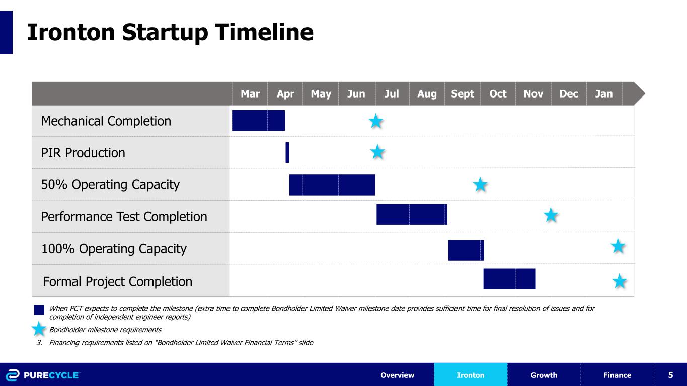 3 4Q Update: Ironton and Future Growth IRONTON GROWTH FINANCE • Executed limited waiver with bondholders that adjusts milestone dates for the commissioning of the Ironton project • Ironton is nearly mechanically complete, remainder of installation activities expected to be completed in April • Expecting first pellets in April • Selected Formerra for US Ultra Pure PP Distribution Services for US operations • Amended agreement with AEDA to extend Augusta's initial project funding deadline to June 30, 2023 • Selected to develop 1st European purification facility at the Port of Antwerp-Burges in Belgium • Signed an HOA with Mitsui that outlines the terms of our expected JVA. Short-list of sites being evaluated in Japan • Finalizing JV development budget, feedstock design, and financing strategy for the Ulsan, South Korea facility with SK geo centric • Closed $150M revolving line of credit designed to have the availability of working capital to the company to fund current operations and committed growth initiatives • Active dialogue related to other forms of pre-Ironton capital raising activity • Expect to launch long term Augusta project financing process after Ironton is operational Overview Ironton Growth Finance