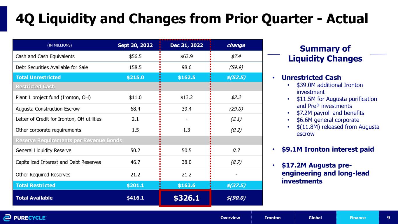 9 4Q Liquidity and Changes from Prior Quarter - Actual (IN MILLIONS) Sept 30, 2022 Dec 31, 2022 change Cash and Cash Equivalents $56.5 $63.9 $7.4 Debt Securities Available for Sale 158.5 98.6 (59.9) Total Unrestricted $215.0 $162.5 $(52.5) Restricted Cash Plant 1 project fund (Ironton, OH) $11.0 $13.2 $2.2 Augusta Construction Escrow 68.4 39.4 (29.0) Letter of Credit for Ironton, OH utilities 2.1 - (2.1) Other corporate requirements 1.5 1.3 (0.2) Reserve Requirements per Revenue Bonds General Liquidity Reserve 50.2 50.5 0.3 Capitalized Interest and Debt Reserves 46.7 38.0 (8.7) Other Required Reserves 21.2 21.2 - Total Restricted $201.1 $163.6 $(37.5) Total Available $416.1 $326.1 $(90.0) Summary of Liquidity Changes • Unrestricted Cash • $39.0M additional Ironton investment • $11.5M for Augusta purification and PreP investments • $7.2M payroll and benefits • $6.6M general corporate • $(11.8M) released from Augusta escrow • $9.1M Ironton interest paid • $17.2M Augusta pre- engineering and long-lead investments Overview Ironton Global Finance