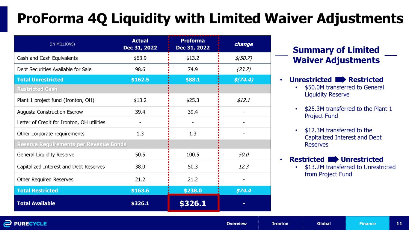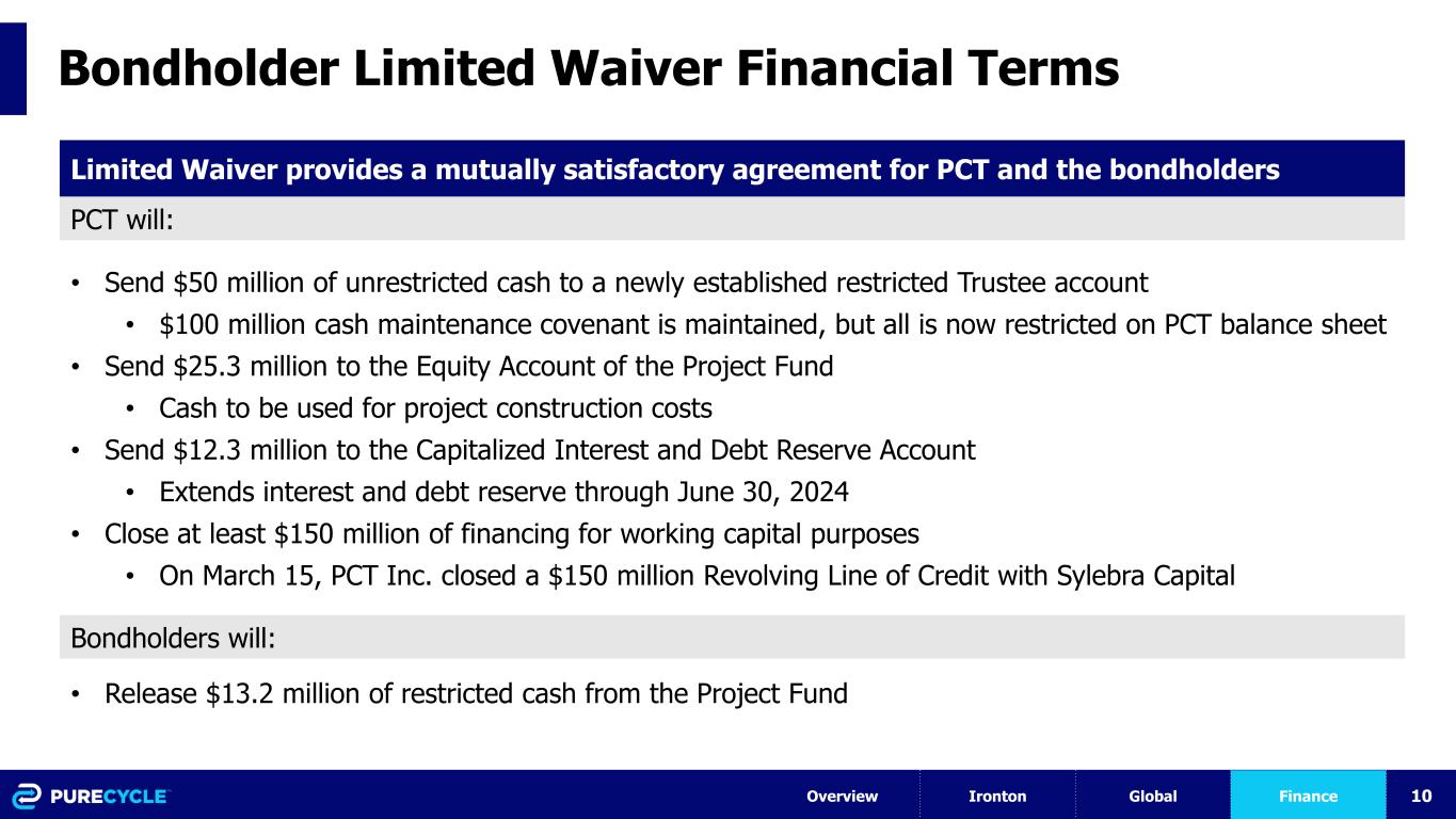 10 Bondholder Limited Waiver Financial Terms Limited Waiver provides a mutually satisfactory agreement for PCT and the bondholders PCT will: • Send $50 million of unrestricted cash to a newly established restricted Trustee account • $100 million cash maintenance covenant is maintained, but all is now restricted on PCT balance sheet • Send $25.3 million to the Equity Account of the Project Fund • Cash to be used for project construction costs • Send $12.3 million to the Capitalized Interest and Debt Reserve Account • Extends interest and debt reserve through June 30, 2024 • Close at least $150 million of financing for working capital purposes • On March 15, PCT Inc. closed a $150 million Revolving Line of Credit with Sylebra Capital Bondholders will: • Release $13.2 million of restricted cash from the Project Fund Overview Ironton Global Finance