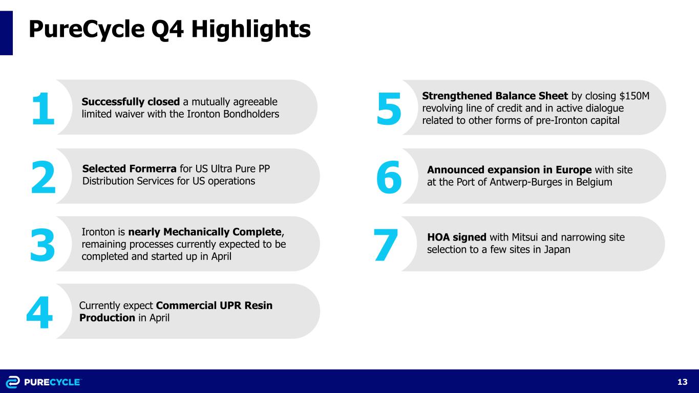 13 PureCycle Q4 Highlights 1 2 3 5 6 4 Currently expect Commercial UPR Resin Production in April Strengthened Balance Sheet by closing $150M revolving line of credit and in active dialogue related to other forms of pre-Ironton capital Ironton is nearly Mechanically Complete, remaining processes currently expected to be completed and started up in April 7 Announced expansion in Europe with site at the Port of Antwerp-Burges in Belgium HOA signed with Mitsui and narrowing site selection to a few sites in Japan Successfully closed a mutually agreeable limited waiver with the Ironton Bondholders Selected Formerra for US Ultra Pure PP Distribution Services for US operations