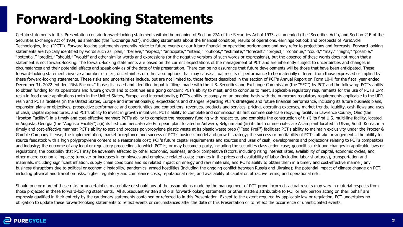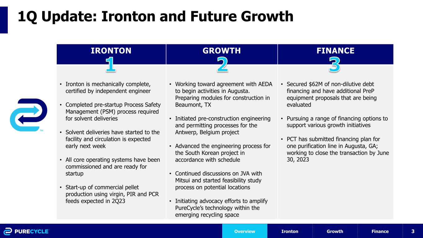 2 Forward-Looking Statements Certain statements in this Presentation contain forward-looking statements within the meaning of Section 27A of the Securities Act of 1933, as amended (the “Securities Act”), and Section 21E of the Securities Exchange Act of 1934, as amended (the “Exchange Act”), including statements about the financial condition, results of operations, earnings outlook and prospects of PureCycle Technologies, Inc. (“PCT”). Forward-looking statements generally relate to future events or our future financial or operating performance and may refer to projections and forecasts. Forward-looking statements are typically identified by words such as “plan,” “believe,” “expect,” “anticipate,” “intend,” “outlook,” “estimate,” “forecast,” “project,” “continue,” “could,” “may,” “might,” “possible,” “potential,” “predict,” “should,” “would” and other similar words and expressions (or the negative versions of such words or expressions), but the absence of these words does not mean that a statement is not forward-looking. The forward-looking statements are based on the current expectations of the management of PCT and are inherently subject to uncertainties and changes in circumstances and their potential effects and speak only as of the date of this presentation. There can be no assurance that future developments will be those that have been anticipated. These forward-looking statements involve a number of risks, uncertainties or other assumptions that may cause actual results or performance to be materially different from those expressed or implied by these forward-looking statements. These risks and uncertainties include, but are not limited to, those factors described in the section of PCT’s Annual Report on Form 10-K for the fiscal year ended December 31, 2022 entitled “Risk Factors,” those discussed and identified in public filings made with the U.S. Securities and Exchange Commission (the “SEC”) by PCT and the following: PCT’s ability to obtain funding for its operations and future growth and to continue as a going concern; PCT's ability to meet, and to continue to meet, applicable regulatory requirements for the use of PCT's UPR resin in food grade applications (both in the United States, Europe, and internationally); PCT's ability to comply on an ongoing basis with the numerous regulatory requirements applicable to the UPR resin and PCT's facilities (in the United States, Europe and internationally); expectations and changes regarding PCT's strategies and future financial performance, including its future business plans, expansion plans or objectives, prospective performance and opportunities and competitors, revenues, products and services, pricing, operating expenses, market trends, liquidity, cash flows and uses of cash, capital expenditures, and PCT's ability to invest in growth initiatives; PCT's ability to complete and commission its first commercial-scale recycling facility in Lawrence County, Ohio (the “Ironton Facility”) in a timely and cost-effective manner; PCT's ability to complete the necessary funding with respect to, and complete the construction of t, (i) its first U.S. multi-line facility, located in Augusta, Georgia (the “Augusta Facility”); (ii) its first commercial-scale European plant located in Antwerp, Belgium and (iii) its first commercial-scale Asian plant located in Ulsan, South Korea, in a timely and cost-effective manner; PCT's ability to sort and process polypropylene plastic waste at its plastic waste prep ("Feed PreP") facilities; PCT's ability to maintain exclusivity under the Procter & Gamble Company license; the implementation, market acceptance and success of PCT's business model and growth strategy; the success or profitability of PCT's offtake arrangements; the ability to source feedstock with a high polypropylene content at a reasonable cost; PCT's future capital requirements and sources and uses of cash; developments and projections relating to PCT's competitors and industry; the outcome of any legal or regulatory proceedings to which PCT is, or may become a party, including the securities class action case; geopolitical risk and changes in applicable laws or regulations; the possibility that PCT may be adversely affected by other economic, business, and/or competitive factors, including rising interest rates, availability of capital, economic cycles, and other macro-economic impacts; turnover or increases in employees and employee-related costs; changes in the prices and availability of labor (including labor shortages), transportation and materials, including significant inflation, supply chain conditions and its related impact on energy and raw materials, and PCT's ability to obtain them in a timely and cost-effective manner; any business disruptions due to political or economic instability, pandemics, armed hostilities (including the ongoing conflict between Russia and Ukraine); the potential impact of climate change on PCT, including physical and transition risks, higher regulatory and compliance costs, reputational risks, and availability of capital on attractive terms; and operational risk. Should one or more of these risks or uncertainties materialize or should any of the assumptions made by the management of PCT prove incorrect, actual results may vary in material respects from those projected in these forward-looking statements. All subsequent written and oral forward-looking statements or other matters attributable to PCT or any person acting on their behalf are expressly qualified in their entirety by the cautionary statements contained or referred to in this Presentation. Except to the extent required by applicable law or regulation, PCT undertakes no obligation to update these forward-looking statements to reflect events or circumstances after the date of this Presentation or to reflect the occurrence of unanticipated events.