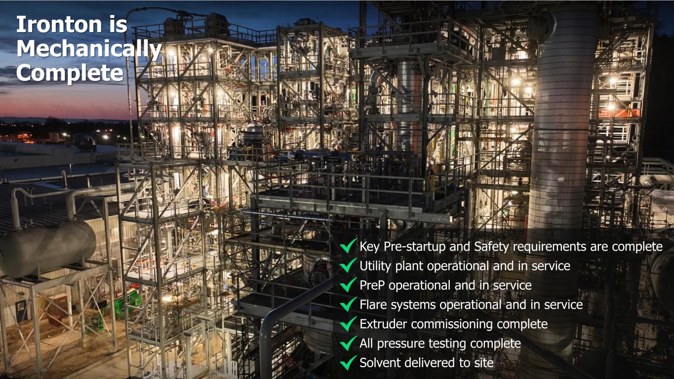 4 Ironton is Mechanically Complete Key Pre-startup and Safety requirements are complete Utility plant operational and in service PreP operational and in service Flare systems operational and in service Extruder commissioning complete All pressure testing complete Solvent delivered to site