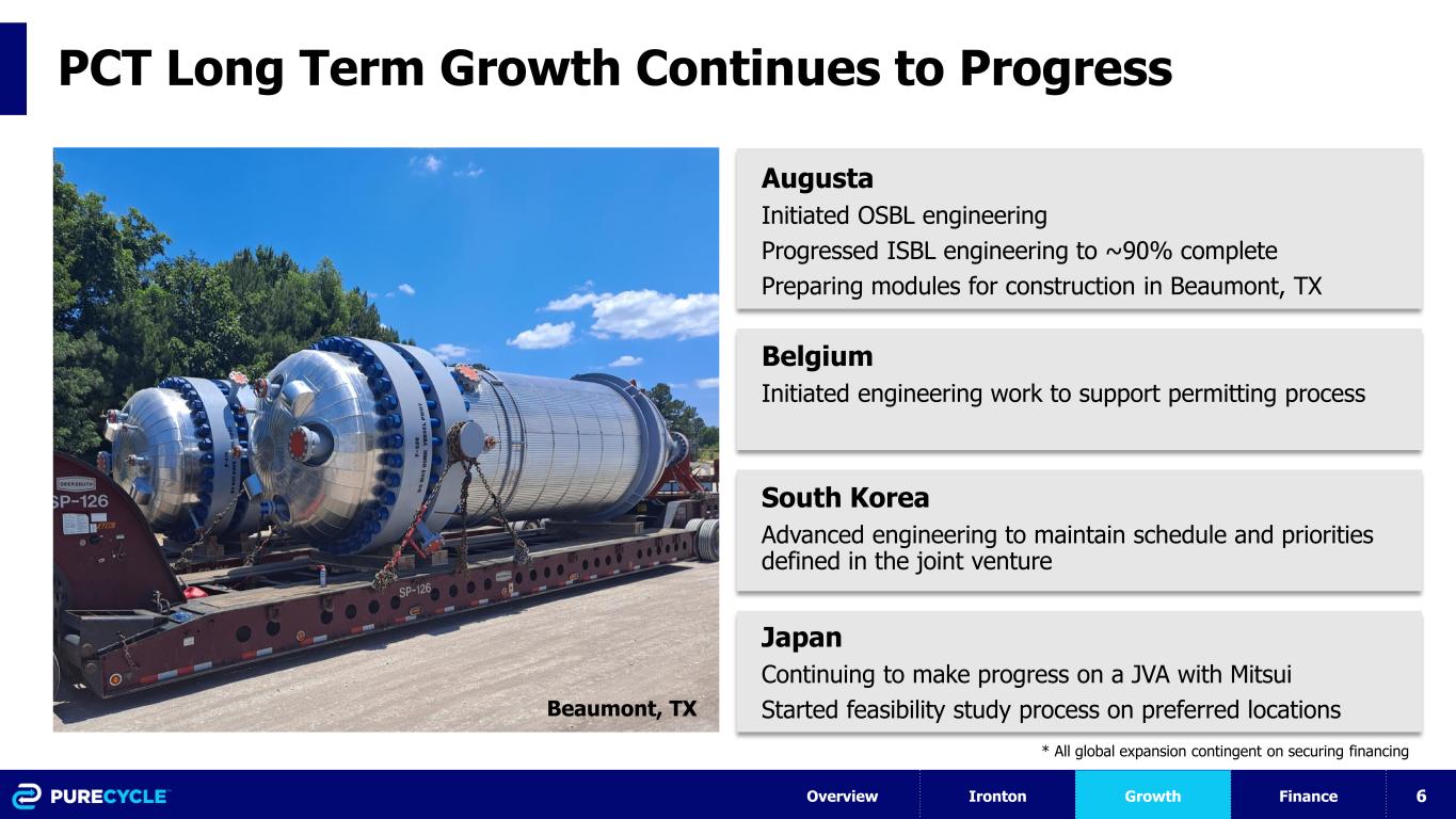 5 Path to Pellets Mar Apr May Jun Jul Aug Sept Oct Nov Dec Jan Mechanical Completion First Pellet Production Performance Test Completion Overview Ironton Growth Finance When PCT expects to complete the milestone (extra time to complete Bondholder Waiver agreement milestone date provides sufficient time for final resolution of issues and for completion of independent engineer reports) Realized adjustments relative to Q4 update Mechanical Completion Delays Due to • Extended low voltage activities • OSBL piping & engineering corrections First Pellet Production Delays Due to • Extended Pressure Test • Extended Extrusion Commissioning • Extended Operations PSSR Bondholder milestone requirements Milestone completed