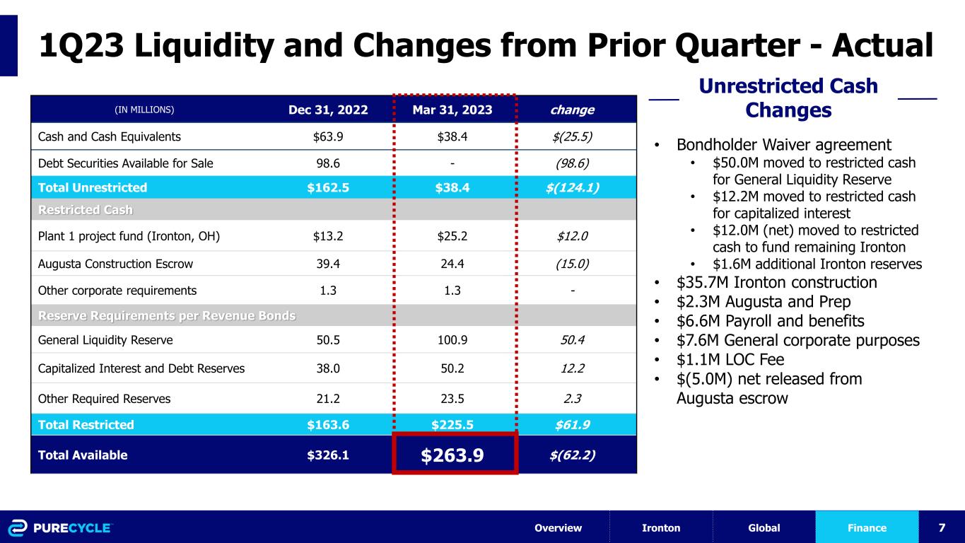 6 Beaumont, TX PCT Long Term Growth Continues to Progress Augusta Initiated OSBL engineering Progressed ISBL engineering to ~90% complete Preparing modules for construction in Beaumont, TX South Korea Advanced engineering to maintain schedule and priorities defined in the joint venture Japan Continuing to make progress on a JVA with Mitsui Started feasibility study process on preferred locations Overview Ironton Growth Finance * All global expansion contingent on securing financing Belgium Initiated engineering work to support permitting process