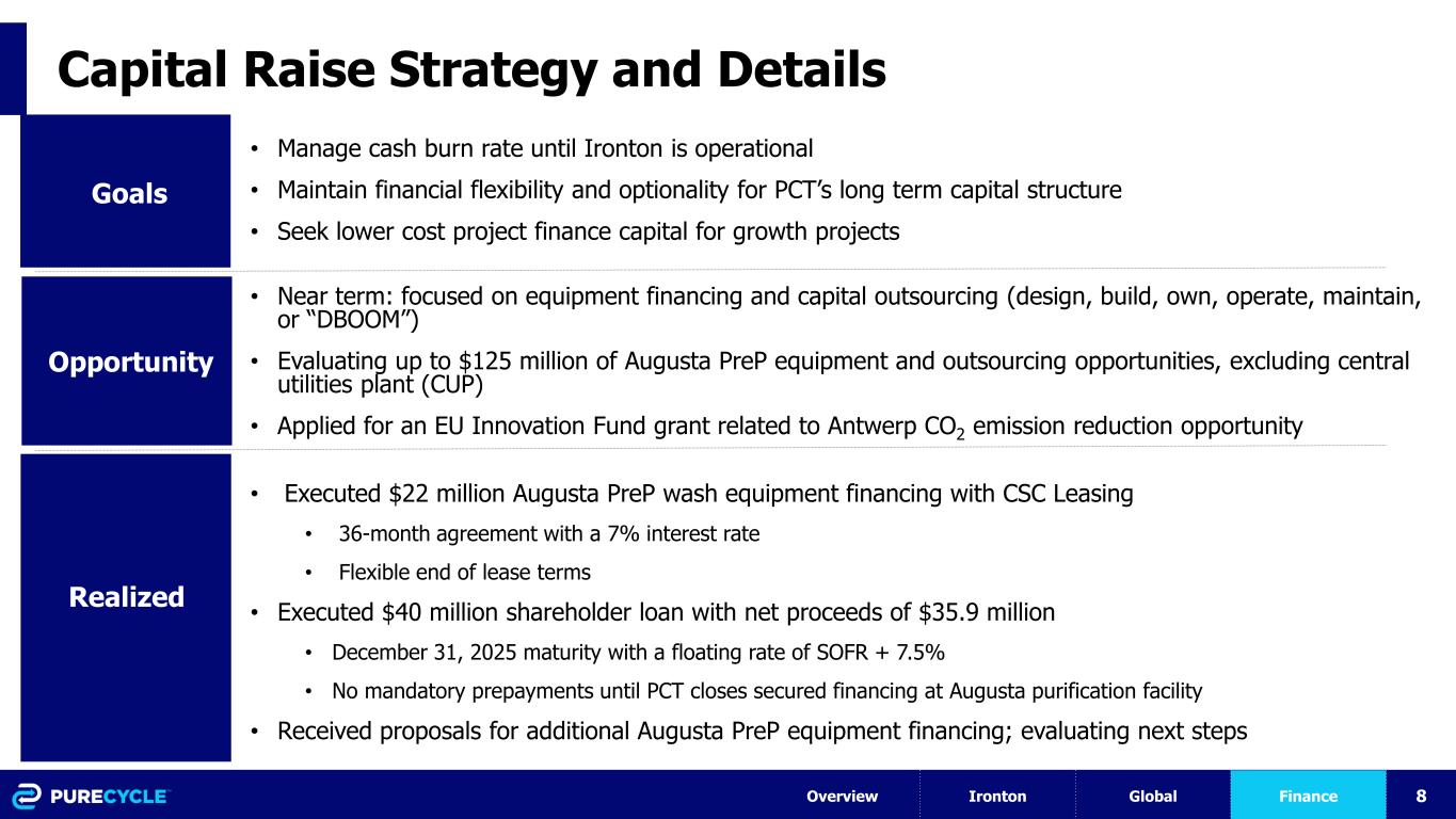7 1Q23 Liquidity and Changes from Prior Quarter - Actual (IN MILLIONS) Dec 31, 2022 Mar 31, 2023 change Cash and Cash Equivalents $63.9 $38.4 $(25.5) Debt Securities Available for Sale 98.6 - (98.6) Total Unrestricted $162.5 $38.4 $(124.1) Restricted Cash Plant 1 project fund (Ironton, OH) $13.2 $25.2 $12.0 Augusta Construction Escrow 39.4 24.4 (15.0) Other corporate requirements 1.3 1.3 - Reserve Requirements per Revenue Bonds General Liquidity Reserve 50.5 100.9 50.4 Capitalized Interest and Debt Reserves 38.0 50.2 12.2 Other Required Reserves 21.2 23.5 2.3 Total Restricted $163.6 $225.5 $61.9 Total Available $326.1 $263.9 $(62.2) Unrestricted Cash Changes • Bondholder Waiver agreement • $50.0M moved to restricted cash for General Liquidity Reserve • $12.2M moved to restricted cash for capitalized interest • $12.0M (net) moved to restricted cash to fund remaining Ironton • $1.6M additional Ironton reserves • $35.7M Ironton construction • $2.3M Augusta and Prep • $6.6M Payroll and benefits • $7.6M General corporate purposes • $1.1M LOC Fee • $(5.0M) net released from Augusta escrow Overview Ironton Global Finance