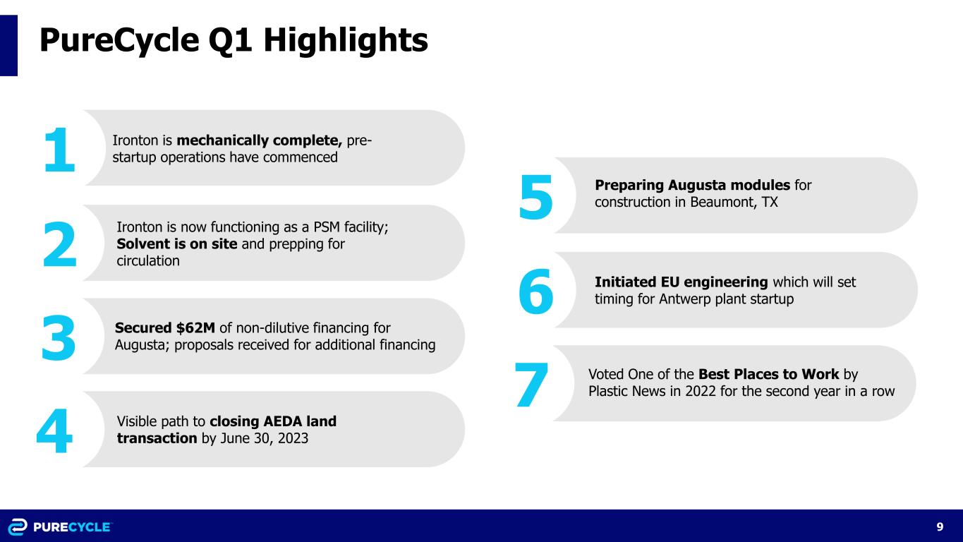 8 Capital Raise Strategy and Details Overview Ironton Global Finance • Manage cash burn rate until Ironton is operational • Maintain financial flexibility and optionality for PCT’s long term capital structure • Seek lower cost project finance capital for growth projects • Near term: focused on equipment financing and capital outsourcing (design, build, own, operate, maintain, or “DBOOM”) • Evaluating up to $125 million of Augusta PreP equipment and outsourcing opportunities, excluding central utilities plant (CUP) • Applied for an EU Innovation Fund grant related to Antwerp CO2 emission reduction opportunity • Executed $22 million Augusta PreP wash equipment financing with CSC Leasing • 36-month agreement with a 7% interest rate • Flexible end of lease terms • Executed $40 million shareholder loan with net proceeds of $35.9 million • December 31, 2025 maturity with a floating rate of SOFR + 7.5% • No mandatory prepayments until PCT closes secured financing at Augusta purification facility • Received proposals for additional Augusta PreP equipment financing; evaluating next steps Goals Opportunity Realized