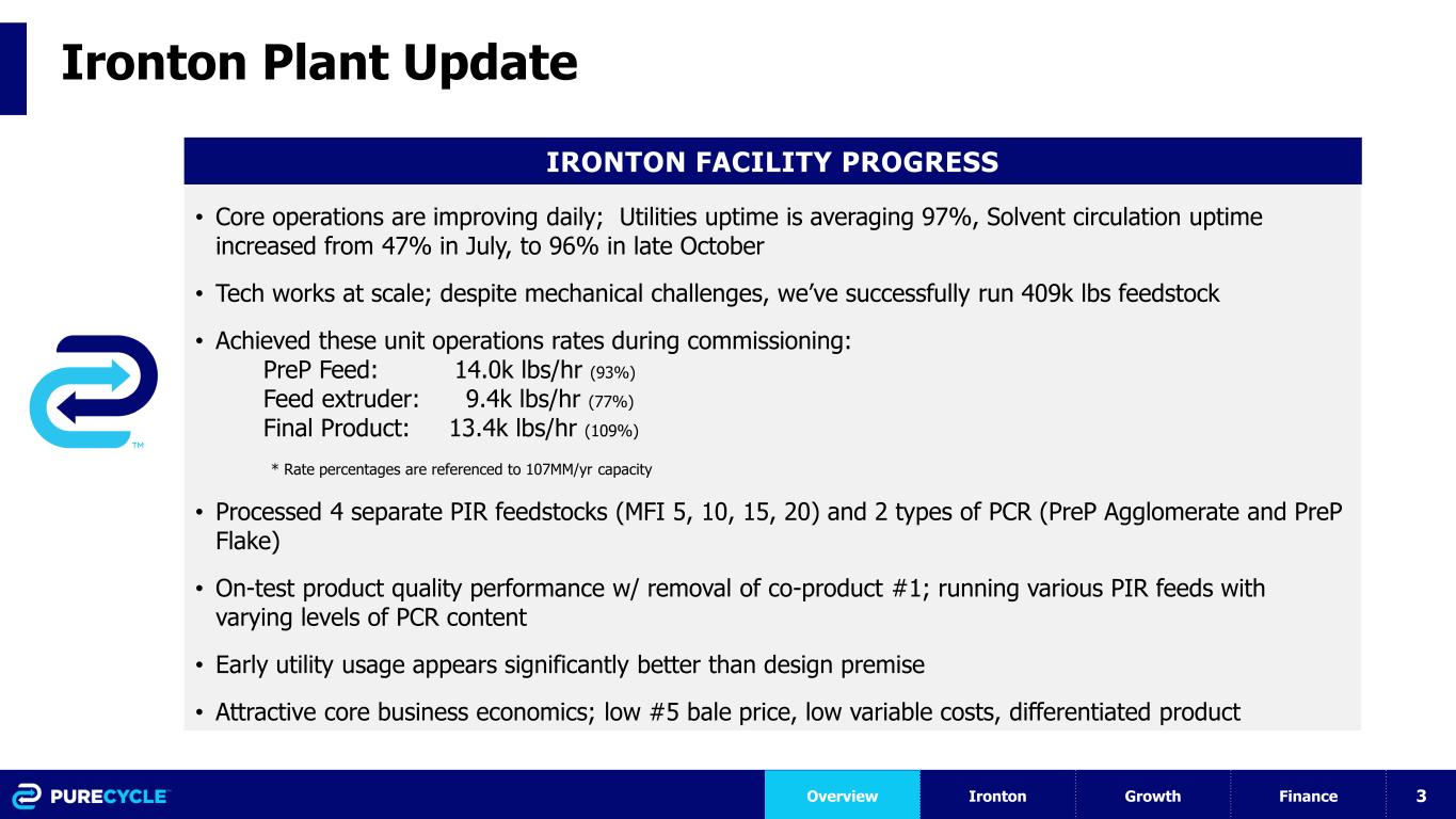 2 Forward-Looking Statements Certain statements in this Presentation contain forward-looking statements within the meaning of Section 27A of the Securities Act of 1933, as amended (the “Securities Act”), and Section 21E of the Securities Exchange Act of 1934, as amended (the “Exchange Act”), including statements about the financial condition, results of operations, earnings outlook and prospects of PureCycle Technologies, Inc. (“PCT”). Forward-looking statements generally relate to future events or our future financial or operating performance and may refer to projections and forecasts. Forward-looking statements are typically identified by words such as “plan,” “believe,” “expect,” “anticipate,” “intend,” “outlook,” “estimate,” “forecast,” “project,” “continue,” “could,” “may,” “might,” “possible,” “potential,” “predict,” “should,” “would” and other similar words and expressions (or the negative versions of such words or expressions), but the absence of these words does not mean that a statement is not forward-looking. The forward-looking statements are based on the current expectations of the management of PCT and are inherently subject to uncertainties and changes in circumstances and their potential effects and speak only as of the date of this presentation. There can be no assurance that future developments will be those that have been anticipated. These forward-looking statements involve a number of risks, uncertainties or other assumptions that may cause actual results or performance to be materially different from those expressed or implied by these forward-looking statements. These risks and uncertainties include, but are not limited to, those factors described in the section of PCT’s Annual Report on Form 10-K for the fiscal year ended December 31, 2022 entitled “Risk Factors,” those discussed and identified in other public filings made with the U.S. Securities and Exchange Commission (the “SEC”) by PCT and the following: PCT’s ability to obtain funding for its operations and future growth and to continue as a going concern; PCT's ability to meet, and to continue to meet, applicable regulatory requirements for the use of PCT's UPR resin in food grade applications (including in the United States, Europe, Asia and other international locations); PCT's ability to comply on an ongoing basis with the numerous regulatory requirements applicable to the UPR resin and PCT's facilities (including in the United States, Europe, Asia and future international locations); expectations and changes regarding PCT's strategies and future financial performance, including its future business plans, expansion plans or objectives, prospective performance and opportunities and competitors, revenues, products and services, pricing, operating expenses, market trends, liquidity, cash flows and uses of cash, capital expenditures, and PCT's ability to invest in growth initiatives; the ability of PCT's first commercial-scale recycling facility in Lawrence County, Ohio (the “Ironton Facility”) appropriately certified by Leidos Engineering, LLC, following certain performance and other tests, and commence full-scale commercial operations in a timely and cost-effective manner; PCT's ability to complete the necessary funding with respect to, and complete the construction of t, (i) its first U.S. multi-line facility, located in Augusta, Georgia (the “Augusta Facility”); (ii) its first commercial-scale European plant located in Antwerp, Belgium and (iii) its first commercial-scale Asian plant located in Ulsan, South Korea, in a timely and cost-effective manner; PCT's ability to sort and process polypropylene plastic waste at its plastic waste prep ("Feed PreP") facilities; PCT's ability to maintain exclusivity under the Procter & Gamble Company license; the implementation, market acceptance and success of PCT's business model and growth strategy; the success or profitability of PCT's offtake arrangements; the ability to source feedstock with a high polypropylene content at a reasonable cost; PCT's future capital requirements and sources and uses of cash; developments and projections relating to PCT's competitors and industry; the outcome of any legal or regulatory proceedings to which PCT is, or may become a party, including the securities class action case; geopolitical risk and changes in applicable laws or regulations; the possibility that PCT may be adversely affected by other economic, business, and/or competitive factors, including rising interest rates, availability of capital, economic cycles, and other macro-economic impacts; turnover or increases in employees and employee-related costs; changes in the prices and availability of labor (including labor shortages), transportation and materials, including significant inflation, supply chain conditions and its related impact on energy and raw materials, and PCT's ability to obtain them in a timely and cost-effective manner; any business disruptions due to political or economic instability, pandemics, armed hostilities (including the ongoing conflict between Russia and Ukraine); the potential impact of climate change on PCT, including physical and transition risks, higher regulatory and compliance costs, reputational risks, and availability of capital on attractive terms; and operational risk. Should one or more of these risks or uncertainties materialize or should any of the assumptions made by the management of PCT prove incorrect, actual results may vary in material respects from those projected in these forward-looking statements. All subsequent written and oral forward-looking statements or other matters attributable to PCT or any person acting on their behalf are expressly qualified in their entirety by the cautionary statements contained or referred to in this Presentation. Except to the extent required by applicable law or regulation, PCT undertakes 