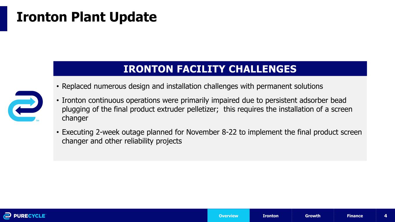 3 Ironton Plant Update IRONTON FACILITY PROGRESS • Core operations are improving daily; Utilities uptime is averaging 97%, Solvent circulation uptime increased from 47% in July, to 96% in late October • Tech works at scale; despite mechanical challenges, we’ve successfully run 409k lbs feedstock • Achieved these unit operations rates during commissioning: PreP Feed: 14.0k lbs/hr (93%) Feed extruder: 9.4k lbs/hr (77%) Final Product: 13.4k lbs/hr (109%) * Rate percentages are referenced to 107MM/yr capacity • Processed 4 separate PIR feedstocks (MFI 5, 10, 15, 20) and 2 types of PCR (PreP Agglomerate and PreP Flake) • On-test product quality performance w/ removal of co-product #1; running various PIR feeds with varying levels of PCR content • Early utility usage appears significantly better than design premise • Attractive core business economics; low #5 bale price, low variable costs, differentiated product Overview Ironton Growth Finance