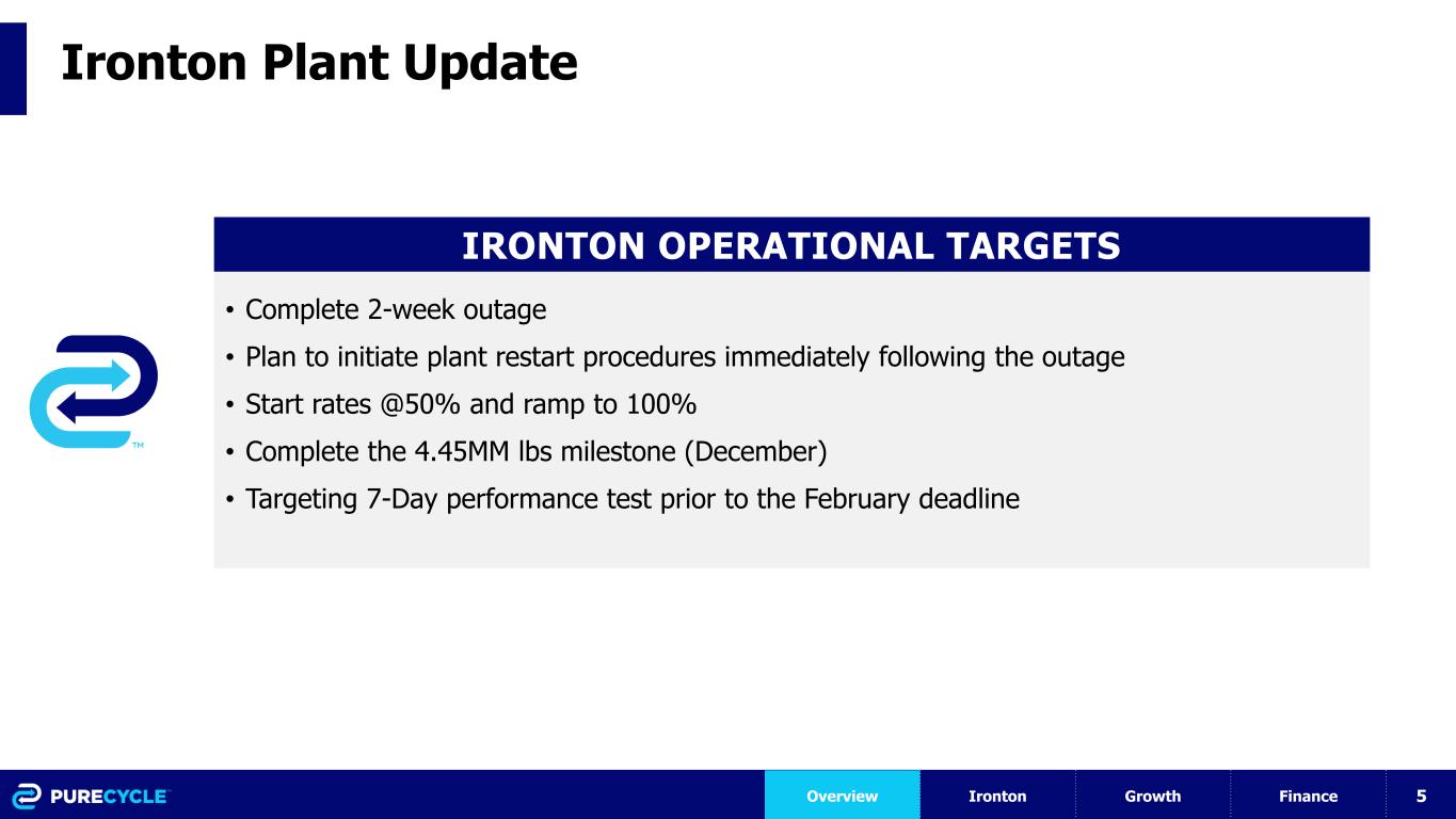 4 Ironton Plant Update IRONTON FACILITY CHALLENGES • Replaced numerous design and installation challenges with permanent solutions • Ironton continuous operations were primarily impaired due to persistent adsorber bead plugging of the final product extruder pelletizer; this requires the installation of a screen changer • Executing 2-week outage planned for November 8-22 to implement the final product screen changer and other reliability projects Overview Ironton Growth Finance