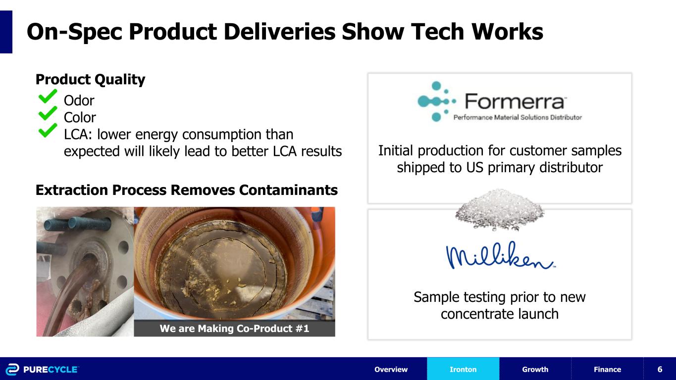 5 Ironton Plant Update IRONTON OPERATIONAL TARGETS • Complete 2-week outage • Plan to initiate plant restart procedures immediately following the outage • Start rates @50% and ramp to 100% • Complete the 4.45MM lbs milestone (December) • Targeting 7-Day performance test prior to the February deadline Overview Ironton Growth Finance