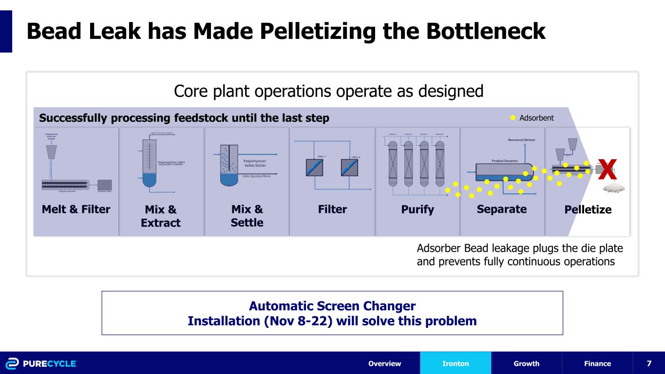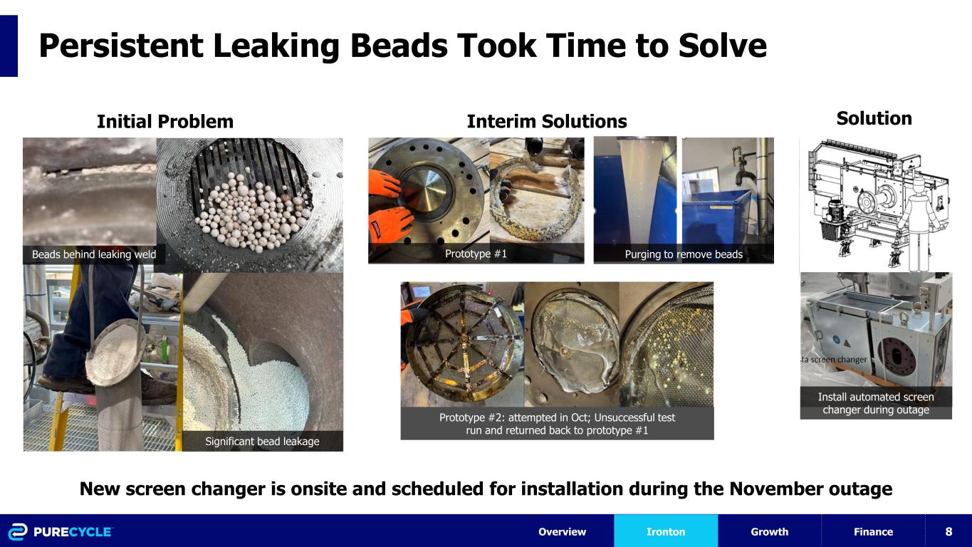7 Melt & Filter Mix & Extract Mix & Settle Purify Separate Pelletize z Filter Bead Leak has Made Pelletizing the Bottleneck Overview Ironton Growth Finance X Adsorber Bead leakage plugs the die plate and prevents fully continuous operations Successfully processing feedstock until the last step Adsorbent Core plant operations operate as designed Automatic Screen Changer Installation (Nov 8-22) will solve this problem